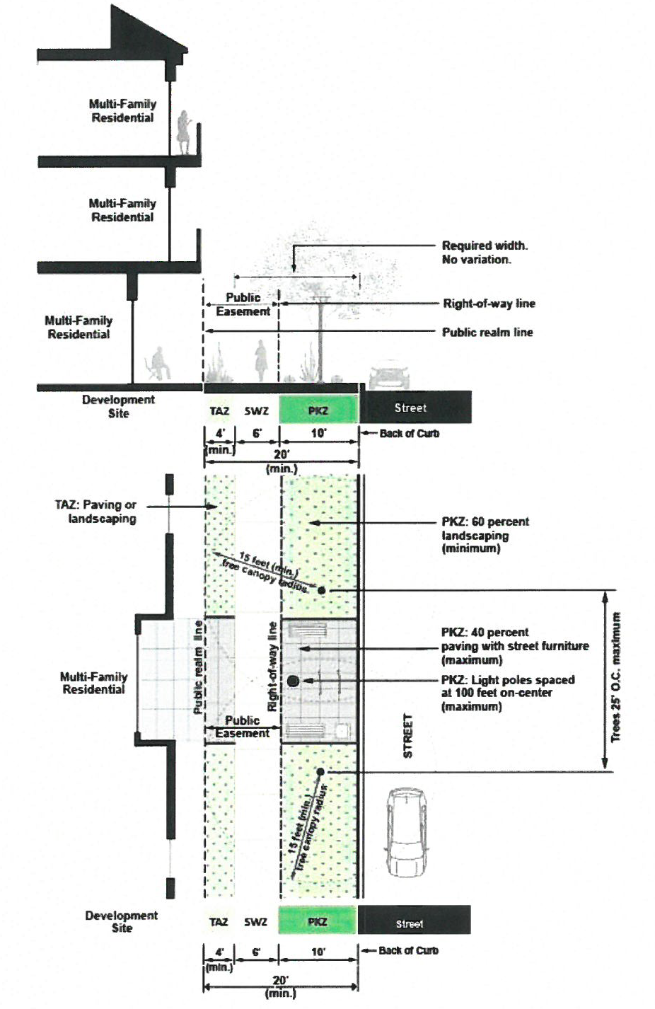 Parkway Zone (PKZ). There shall be a required ten-foot parkway zone width measured from the back-of-curb to the SWZ.
