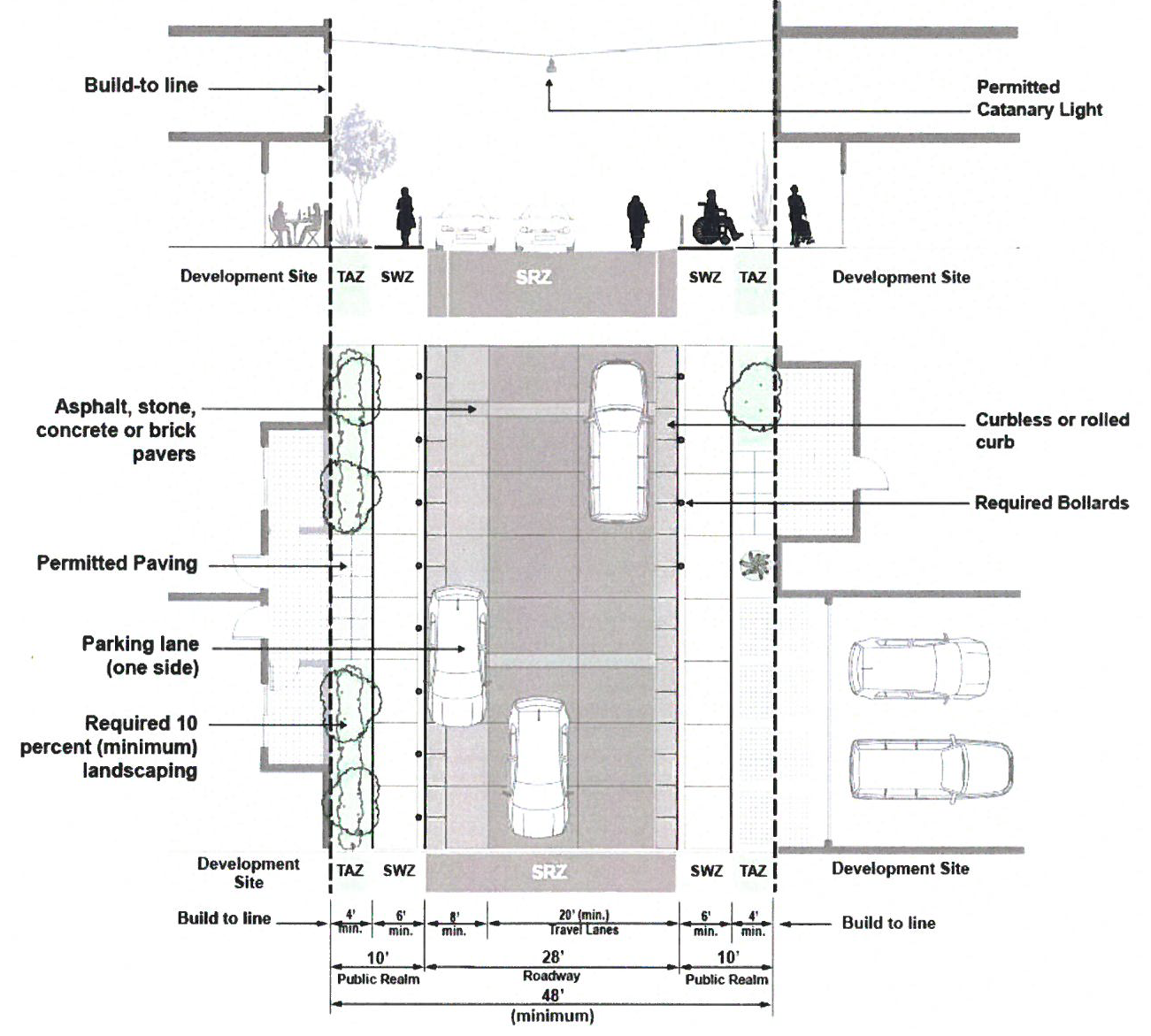 Shared Roadway Zone (SRZ). Motor vehicle traffic shall be permitted to include either one-way or two-way traffic patterns. A twenty-foot minimum width multi-modal roadway shall be provided.