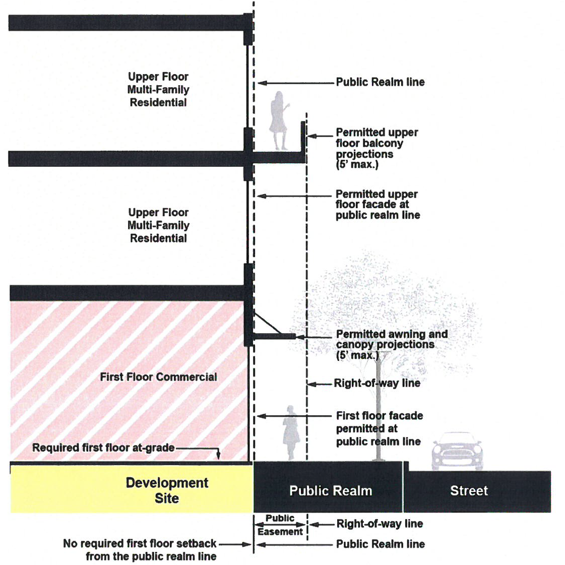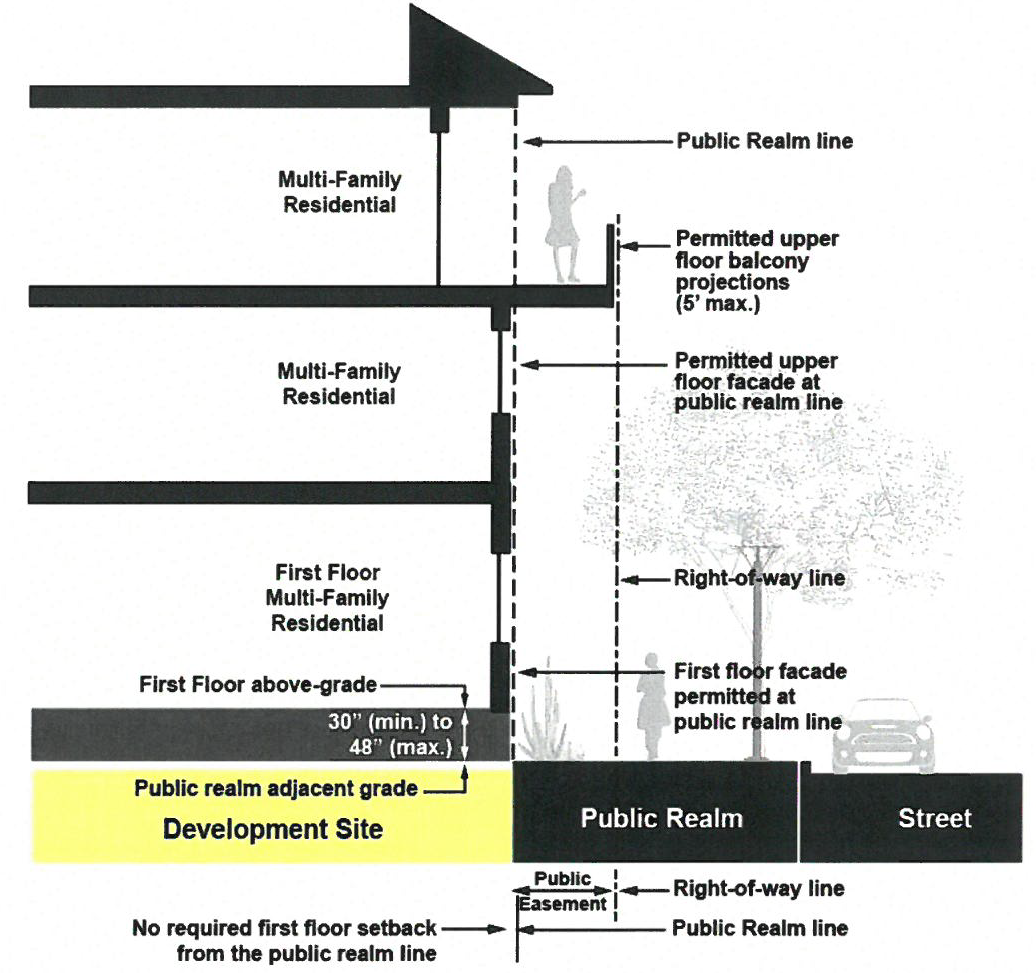 Public Realm Setback. All new multi-family development on sites that front Urban Residential with Parking, Urban Street Two-Lane, and Urban Street Four-Lane shall comply with a fifteen-foot minimum first floor setback measured from the back-of-curb to the public realm-line on public streets. No first-floor building façade shall be located beyond the public realm-line as specified in Figure 17.20.010.1.