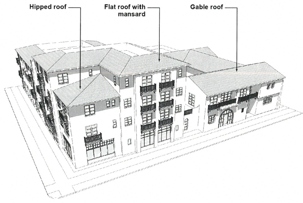 Roof forms—Sloped roof forms shall comprise a minimum of eighty (80) percent of the total roof area. Hipped or gabled roof forms with a minimum slope of 3:12 and a maximum slope of 4:12 shall be required. A maximum of twenty (20) percent of the total roof area shall be permitted to include flat roofs screened by mansards that have a minimum 3:12 and a maximum 4:12 roof slope.