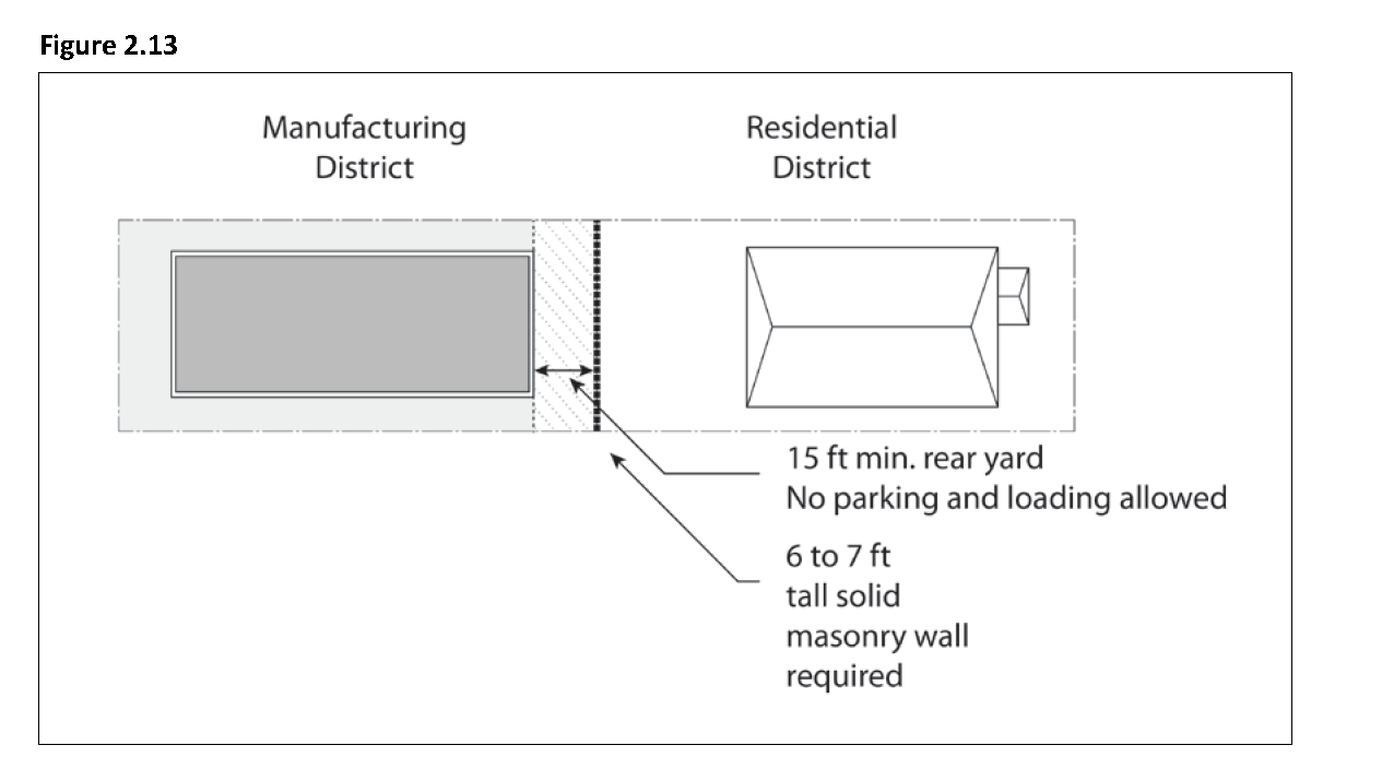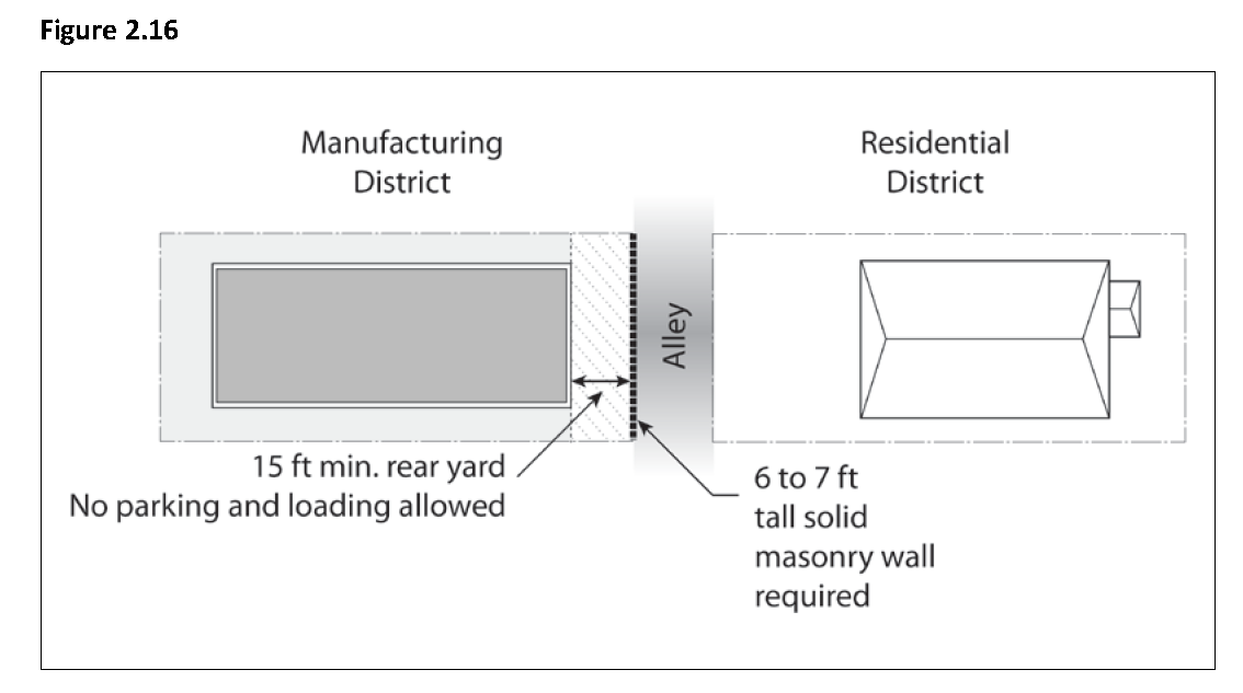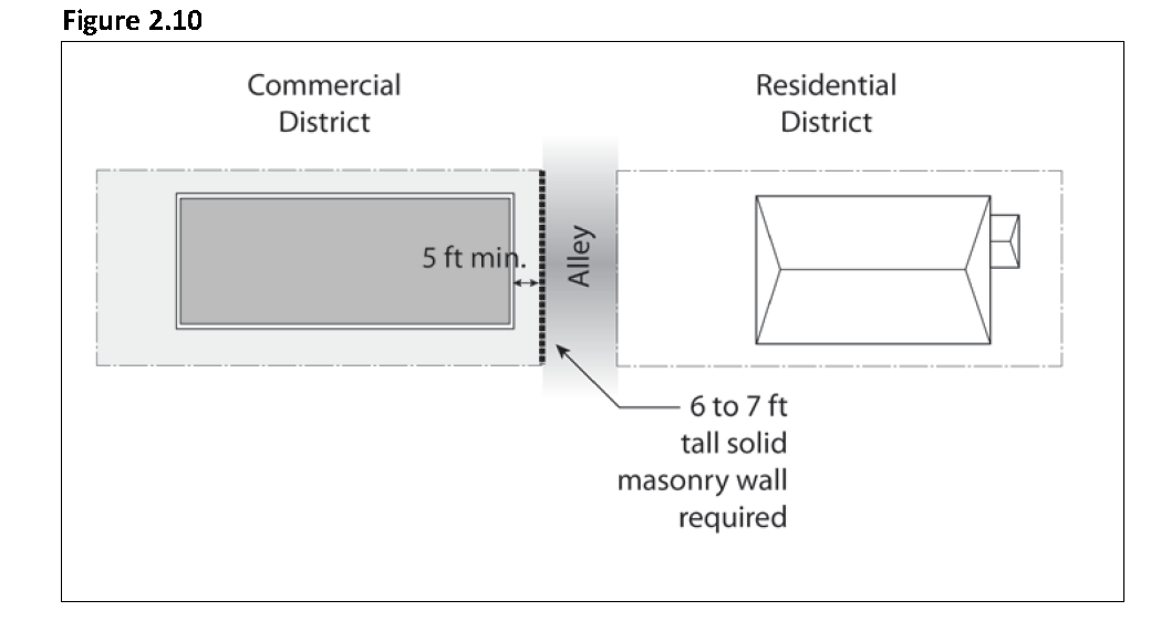 If the district boundary is an alley, the wall shall be along the length of the commercial property line against the alley. No driveway openings are allowed into the alley. A fifteen (15) foot rear yard setback is required between the building and the property line. No parking and loading is allowed in the rear yard. Outdoor storage may be allowed in the rear yard, provided that it is screened from public view.