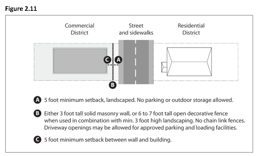Exception: If the district boundary is a street, any wall constructed along such street in the Commercial District shall be set back from the property line a distance of five (5) feet. Such walls may include solid masonry walls of three (3) feet in height, or open decorative fences between six (6) and seven (7) feet in height provided that landscaping of minimum three (3) feet height is in place at the start of operations. Chain link fences are not allowed. The space between the wall and the property line shall be landscaped and maintained, and no parking and outdoor storage shall be allowed. Driveway openings may be allowed into the street for approved parking and loading facilities. Structures shall be set back at least an additional five (5) feet from the wall. Outdoor storage is allowed within the setback between the wall and the structure, provided that it is screened from public view.