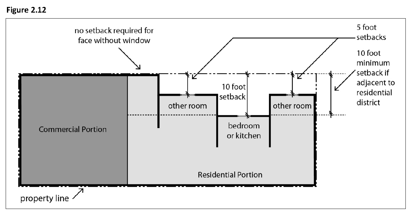 Side and rear yard setback requirements for residential units. In order to provide light and air for residential units in mixed-use buildings, the following minimum setbacks apply to the residential portion of the building(s). In any case in which an interior yard is also adjacent to a Residential district boundary, the following setbacks shall apply.