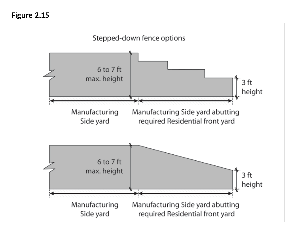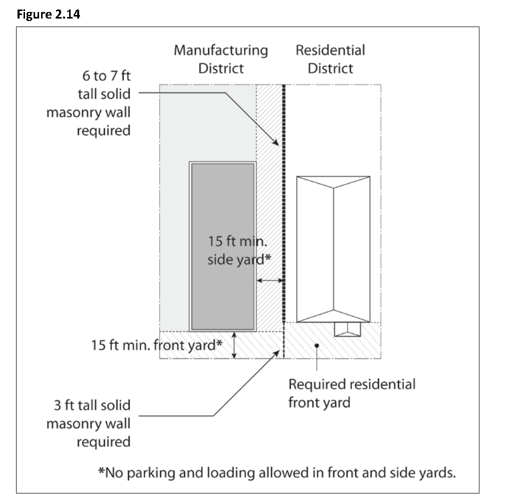 Fences and yards. Where a site in a Manufacturing/Business district is adjacent to a Residential district, a solid masonry wall not less than six (6) feet nor more than seven (7) feet in height shall be erected along such property line, as follows: