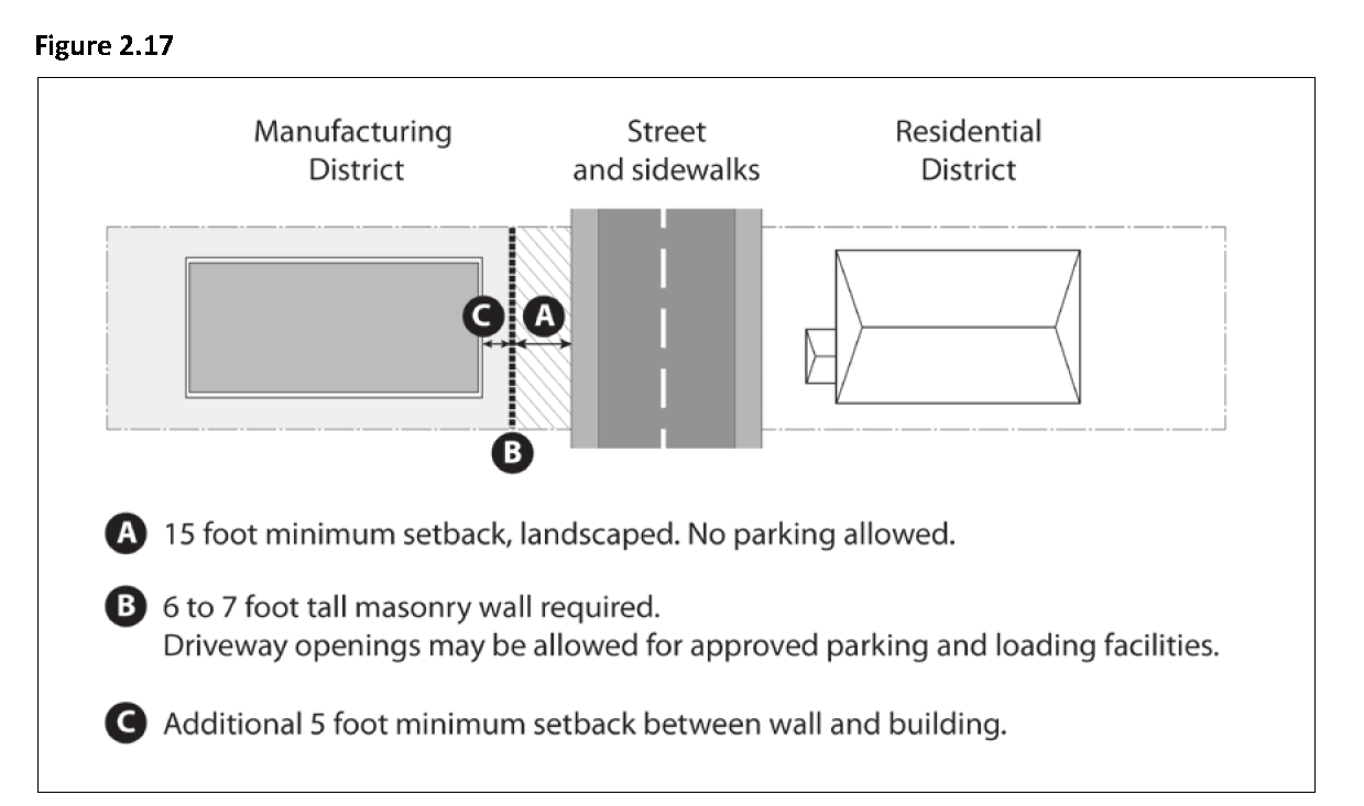 Exception: If the district boundary is a street, any wall constructed along such street shall be set back from the property line a distance of five (5) feet. Such walls may include solid masonry walls of three (3) feet in height, or open decorative fences between six (6) and seven (7) feet in height provided that landscaping of minimum three (3) feet height is in place at the start of operations. Chain link fences are not allowed. The space between the wall and the property line shall be landscaped and maintained; no parking and no outdoor storage shall be allowed. Outdoor storage may be allowed within the setback, provided that it is screened from public view. Driveway openings may be allowed into the street for approved parking and loading facilities. Structures shall be set back at least an additional five (5) feet from the wall. Outdoor storage is allowed within the setback between the wall and the structure, provided that it is screened from public view.
