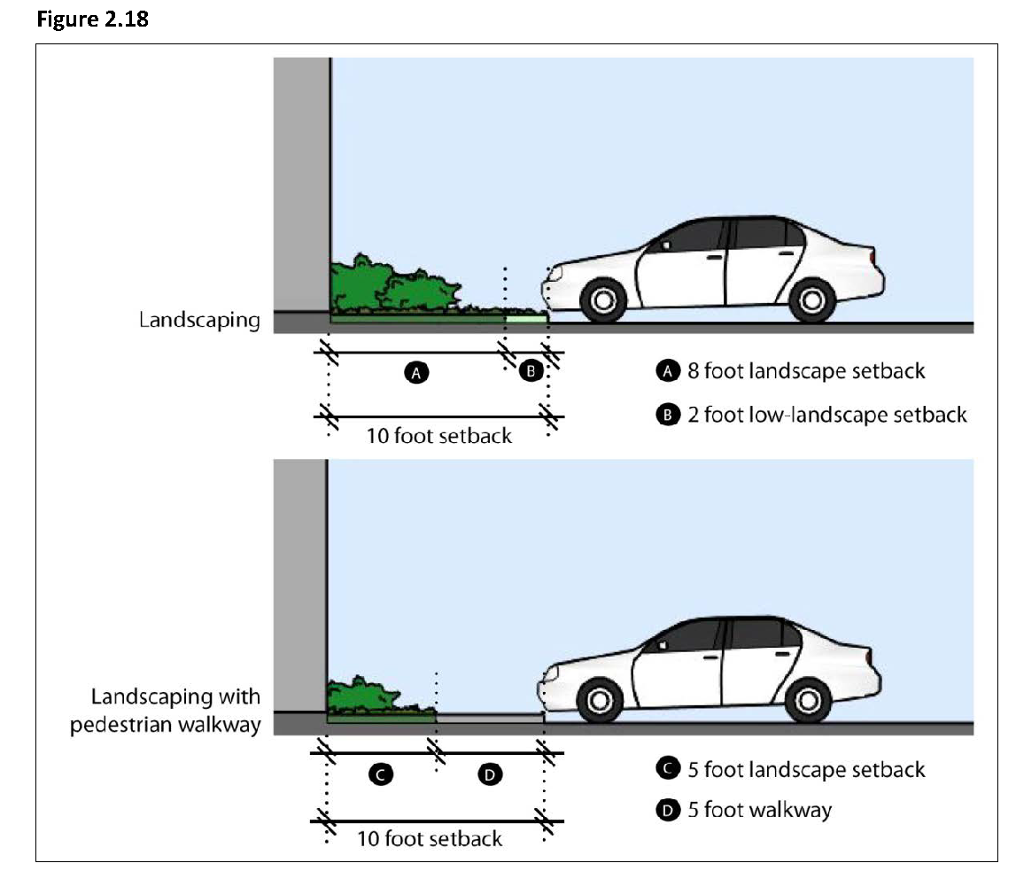 Landscaped setback of parking from on-site buildings. In the MBL districts, parking spaces must be set back at least ten (10) feet from any building wall, and the area between parking and building must be landscaped. Two (2) feet of the landscaped setback shall be low growing plants to allow for vehicle overhang. Up to five (5) feet of this required landscape area may be occupied by a paved pedestrian walkway.