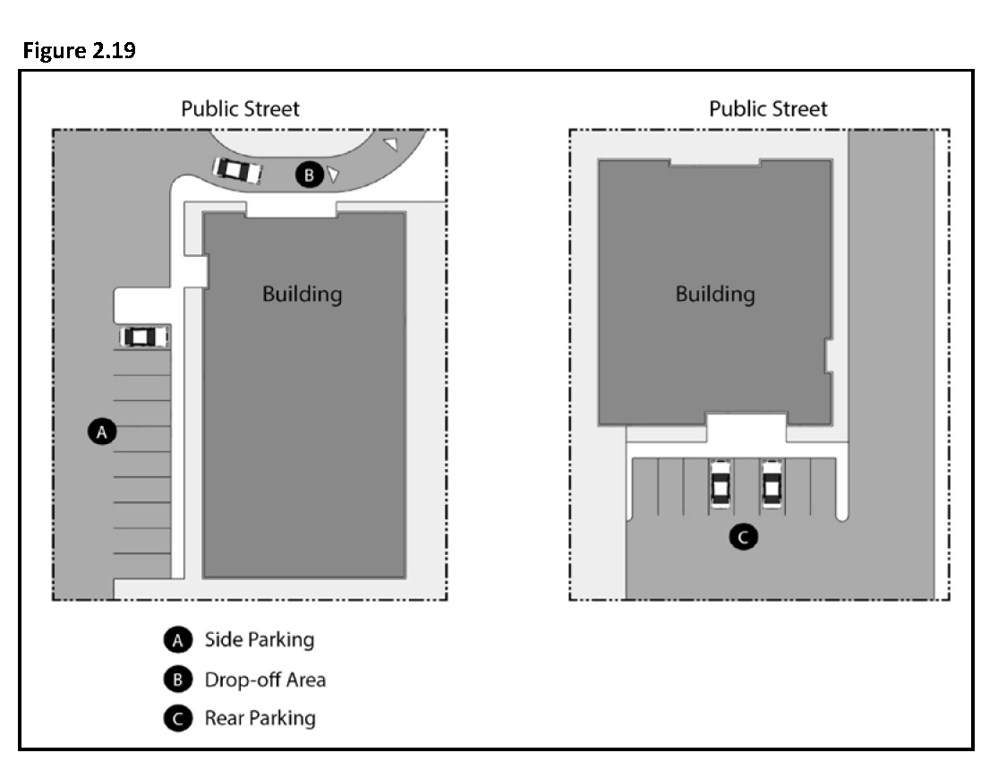 Location of parking. Parking areas shall be located at the rear of the site or at the side of the building, except for drop-off areas which may be located at the primary entry.