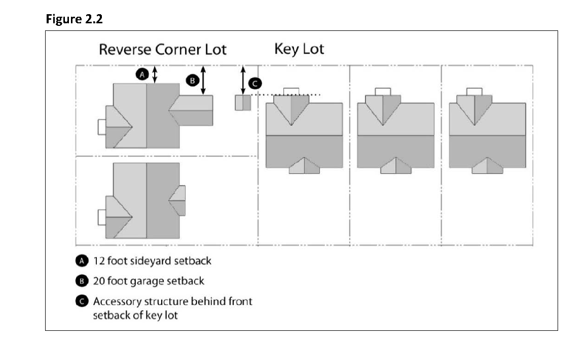 Street side yard - reversed corner lots. Reversed corner lots shall have a minimum street side yard width of twelve (12) feet or the required front yard requirement of the lot in the rear (key lot), whichever is less. The setback shall be twenty (20) feet for garages accessed from the side street. No accessory structure shall project beyond the extension of the required front yard line of the lot in the rear (key lot), unless under one hundred twenty (120) square feet and not permanently affixed to the ground. If a structure requires a building permit it is not permitted in this required setback. Structures in this setback must be behind a 6-foot solid fence as permitted under the planning and zoning code.