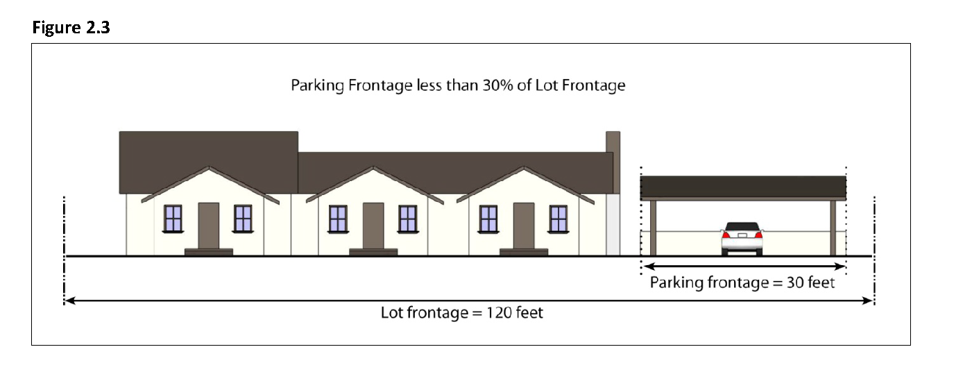 Parking and garage frontage limitation. The total frontage of parking areas visible from the street, including open parking, carports, and garages, but excluding underground parking and parking located behind buildings, shall not exceed thirty (30) percent of the lot frontage. The Community Development Director may approve a modification to this standard where existing development patterns or topographic features make it infeasible to limit parking and garage frontage to thirty (30) percent of lot frontage. Parking areas not visible from the street are not subject to this limitation.