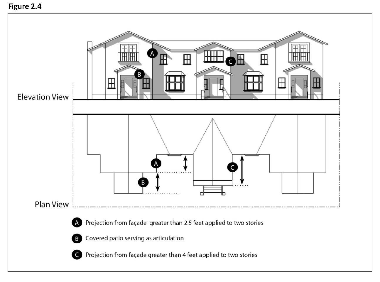 Façade articulation. All street-facing facades shall have at least one horizontal or vertical projection or recess at least four (4) feet in depth, or two (2) projections or recesses at least two and one-half (2.5) feet in depth, for every twenty-five (25) horizontal feet of wall. If located on a building with two (2) or more stories, the articulated elements must be greater than one story in height, and may be grouped rather than evenly spaced in twenty-five (25) foot modules. Building entrances and front porches and projections into required yards such as stoops, bays, overhangs, fireplaces, and trellises may count towards meeting this requirement.
