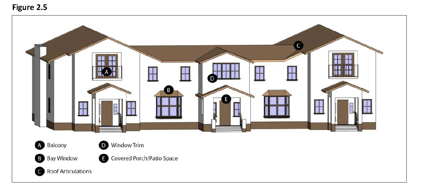 Architectural articulation. All multiple-family residential buildings shall include adequate design features to create visual variety and avoid a large-scale and bulky appearance. Long facades shall be broken up into smaller modules. This requirement can be met by using two (2) or more of the following methods.