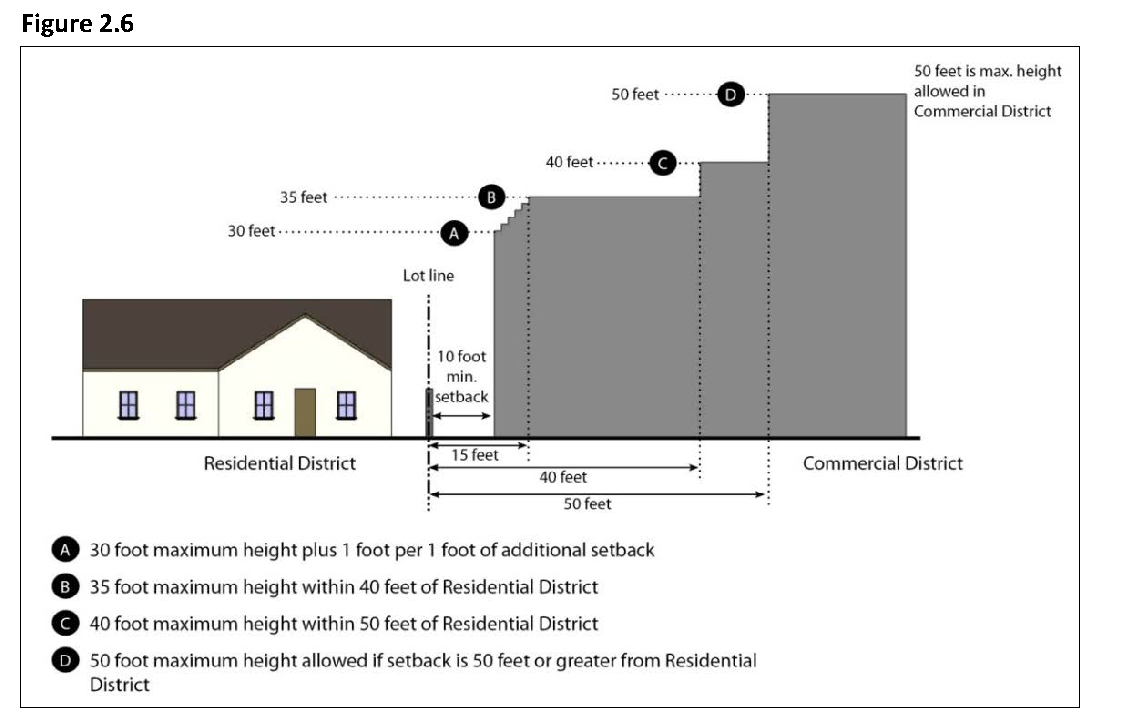 Base development regulations. Table 2.6 prescribes the development standards for the Commercial Districts. Additional regulations are denoted in the right hand column. Section numbers in this column refer to other sections of this chapter, while individual letters refer to subsections that directly follow the table.
