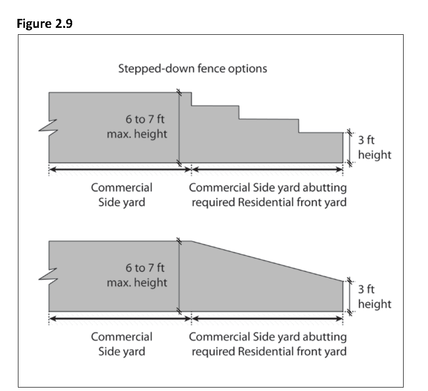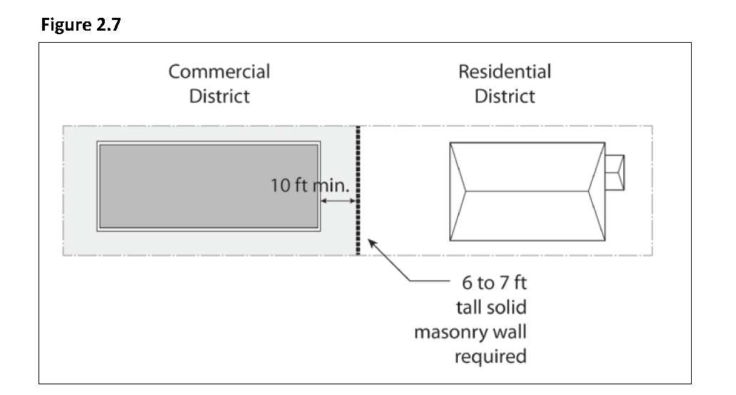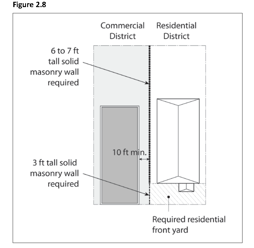 Fences and yards. Where a parcel in a commercial district is adjacent to a residential district, a solid masonry wall not less than six (6) feet nor more than seven (7) feet in height shall be erected along such property line, as follows: