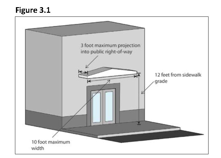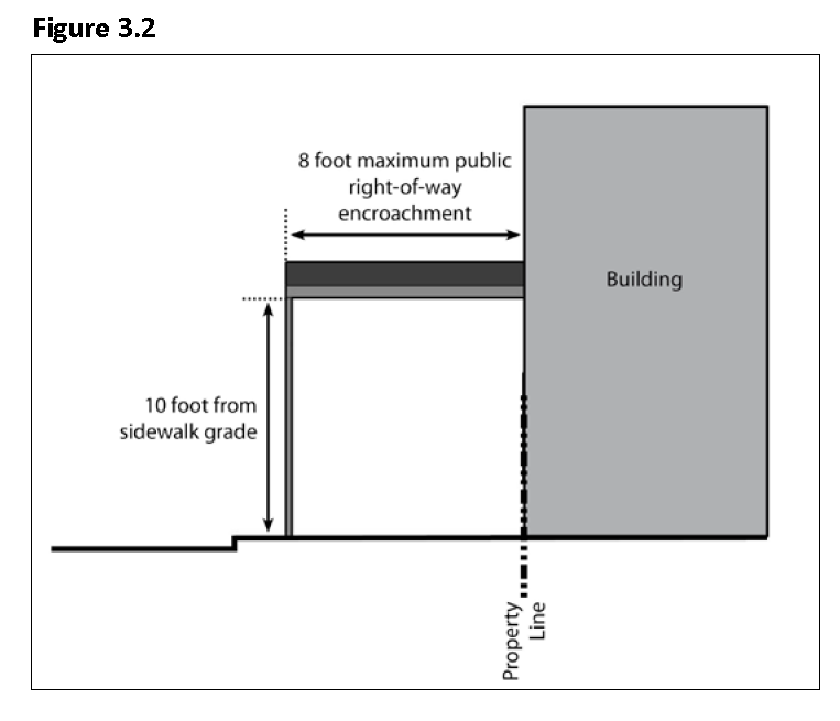 Awnings and overhangs. Awnings, overhangs, and pedestrian shade structures, may encroach into the public right-of-way up to eight (8) feet for the purpose of providing shade over the sidewalk, provided they are at least ten (10) feet above sidewalk grade. Awnings and canopies shall comply with the Downtown Design Guidelines adopted by resolution.