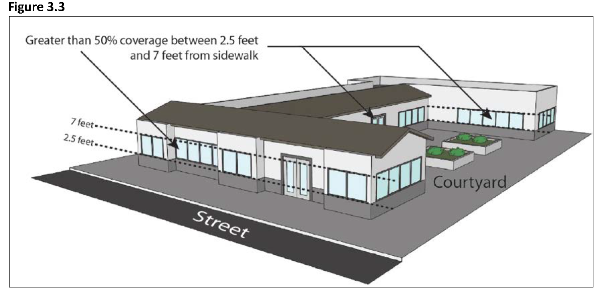 Ground floor windows. Facades facing streets, plazas, and courtyards shall be lined with windows. Where blank walls are necessary, they shall be on side or interior facades not facing streets. Exterior walls facing an adjacent public street, or facing onto a park, plaza, or other public outdoor space shall include windows, doors, or other openings for at least fifty (50) percent of the building wall area located between two and one-half (2.5) and seven (7) feet above the elevation of the sidewalk.