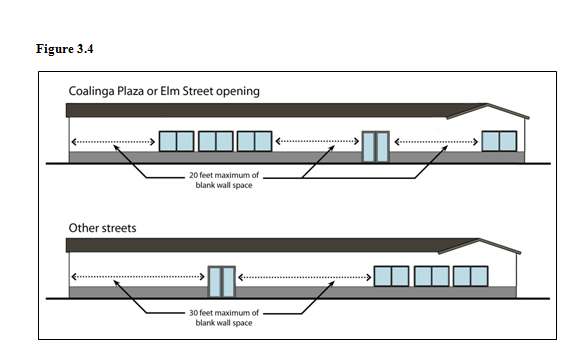 Limits on blank walls. No wall shall run in a continuous plane for more than twenty (20) feet without an opening on Coalinga Plaza or Elm Street, and for more than thirty (30) feet on other streets. Openings fulfilling this requirement shall have transparent glazing and provide views into work areas, display areas, sales areas, lobbies, or similar active spaces, or into window displays that are at least three (3) feet deep.