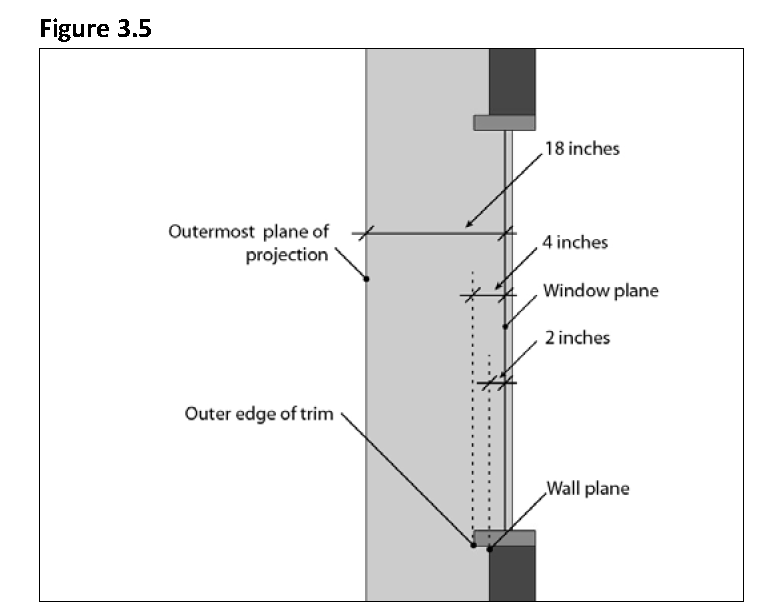 Wall plane articulation. Windows, doors, columns, and other features shall be recessed or project forward from the wall plane, such that there is a minimum two-inch recess of the window plane from the wall plane, a minimum four-inch projection from the window plane and outer edge of trim, and a total of at least eighteen (18) inches from the window plane to the outermost plane of any projection such as a wall, column, or other articulation feature.