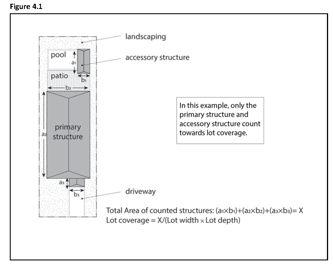 Lot Coverage is the portion of the lot covered by structures measured from exterior wall to exterior wall or posts, and is typically expressed as a percentage or ratio of the entire lot area. Structures include principal and accessory buildings, garages, carports, and roofed porches, but do not include uncovered patios, paved areas and swimming pools.