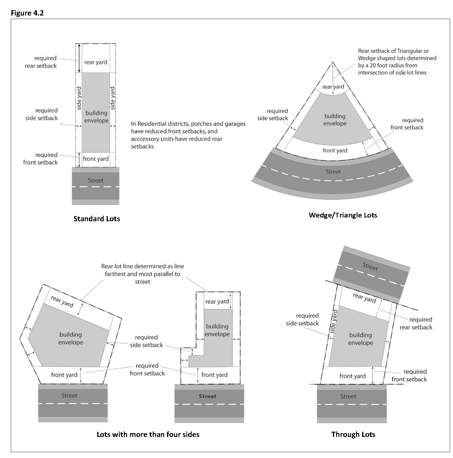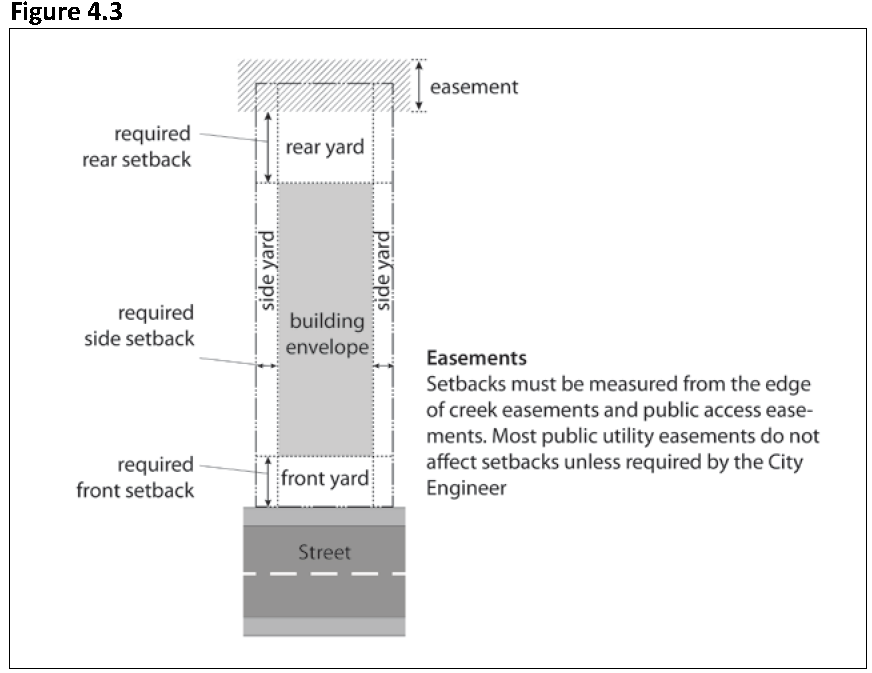 The setback is the perpendicular distance from the property line to the closest point of the exterior wall or posts of the building. The building envelope indicates the limits to which a building can be built on the property based on the required setbacks.