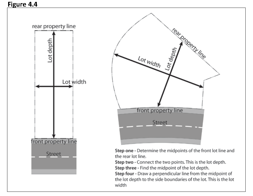 The depth of a lot is the horizontal distance between the front and rear lot lines, measured in the mean direction of the side lot lines.