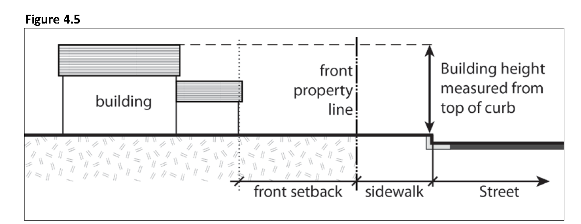 The height of a structure on a property shall be measured from the top of the curb, or from the existing grade at the front property line when no sidewalk and curb are in place, to the highest point of the structure, exclusive of chimneys, ventilators, and any mechanical equipment.