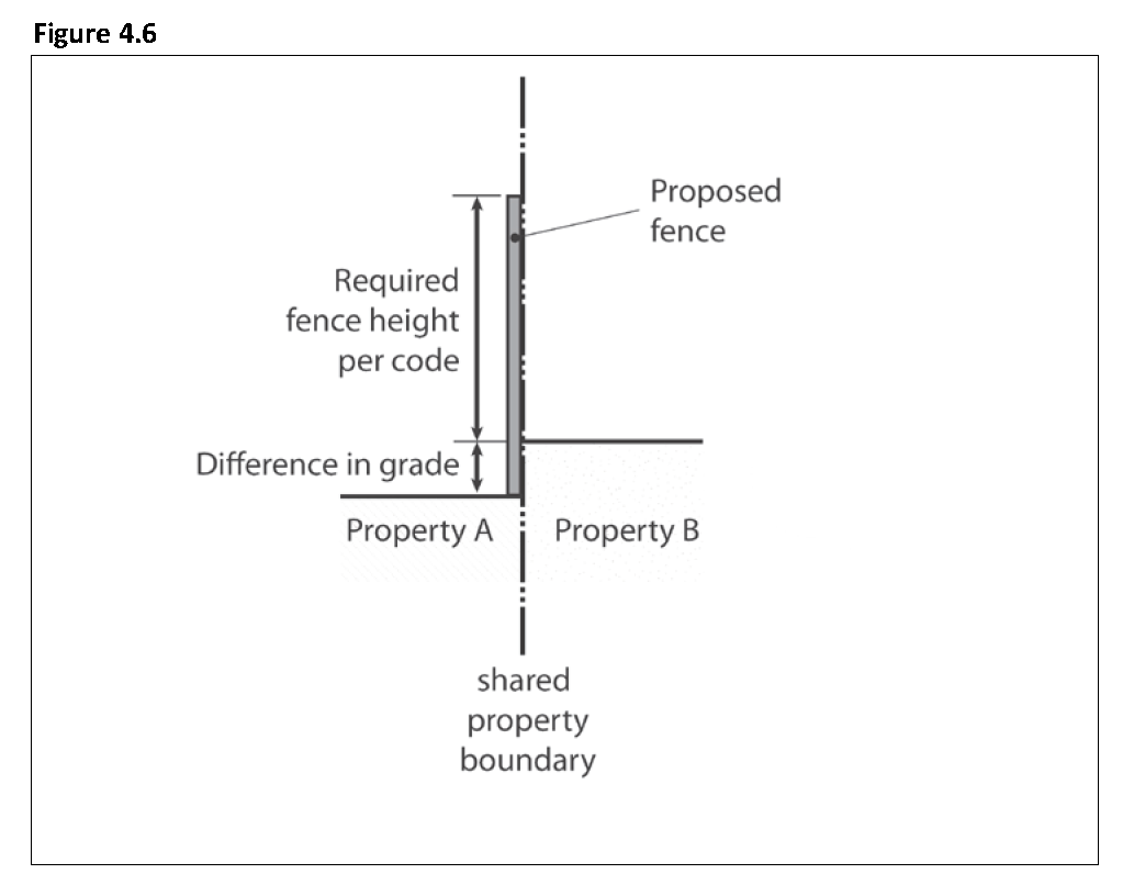The height of a proposed fence shall be measured from the subject property line. If two (2) properties that share a property boundary have different grades, the height of the fence shall be measured from the higher grade.