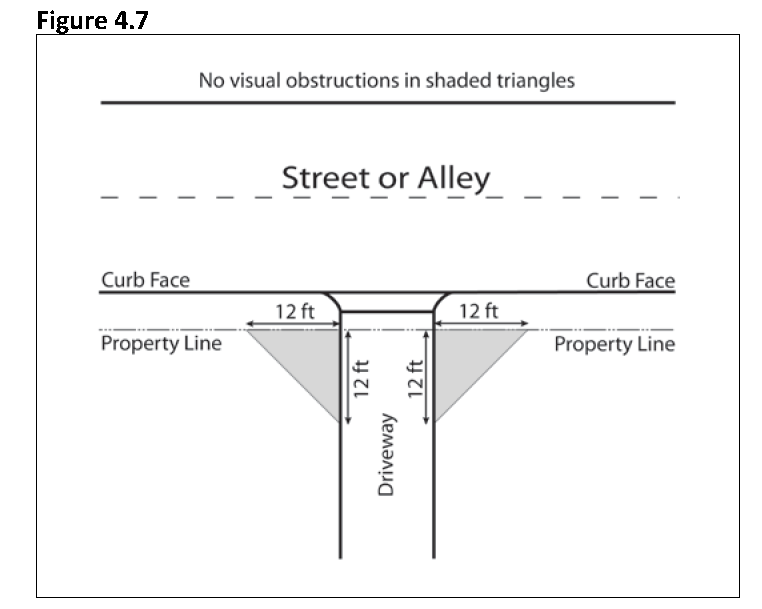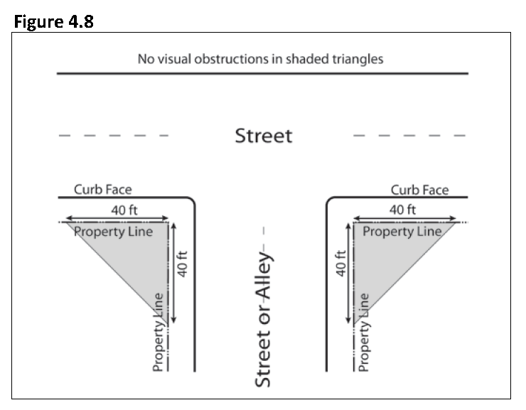 In order to maintain adequate sight distances at all intersecting streets, highways, and driveways intersecting a street or alley, and alleys intersecting a street, the maximum height of fences may be reduced near intersections. Please see Section 9-4.214, Visibility at Driveways and Intersections (Sight Distance).