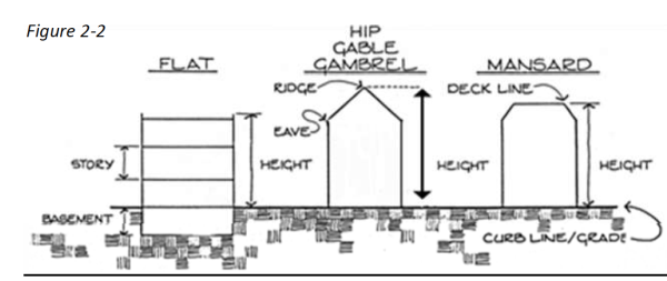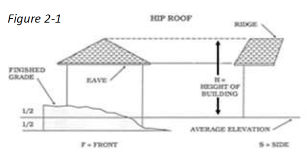 Height, Building: The vertical distance from the grade of the finished surface adjacent to the finished wall of a structure to the highest point of the roof for flat, gable, hip, and gambrel roofs and to the deck line of mansard roofs (see Figure 2-2).