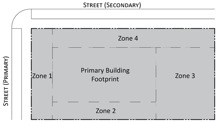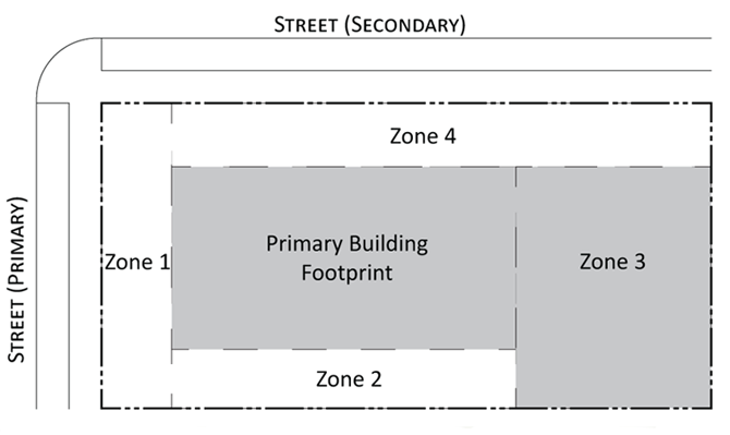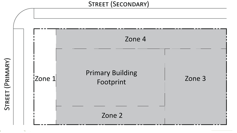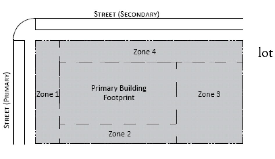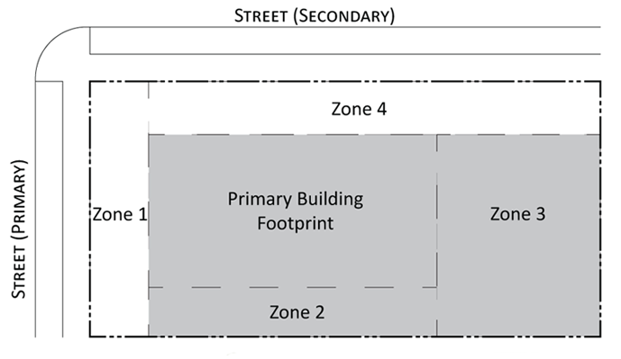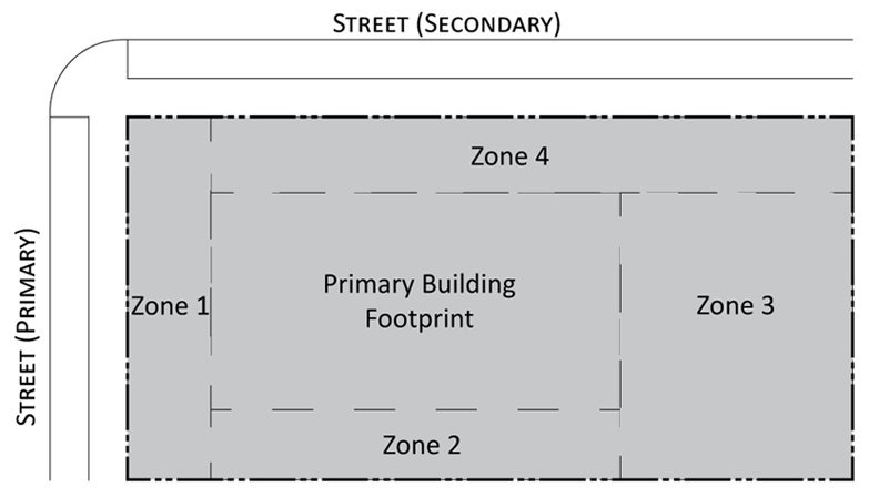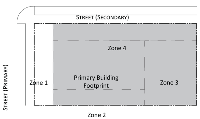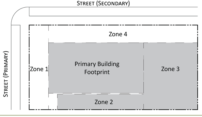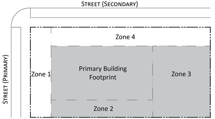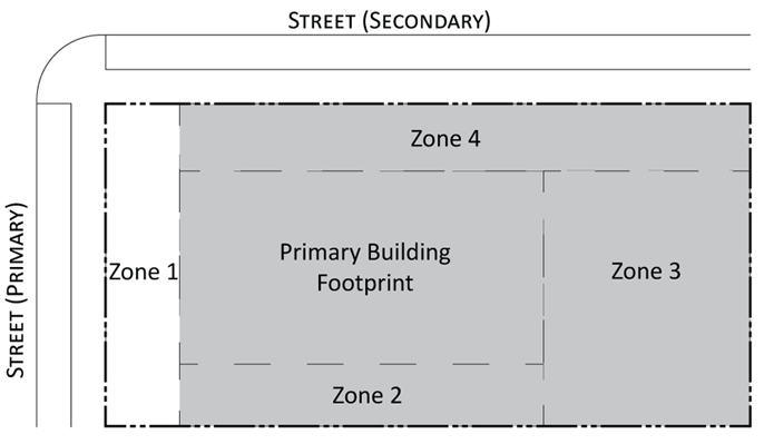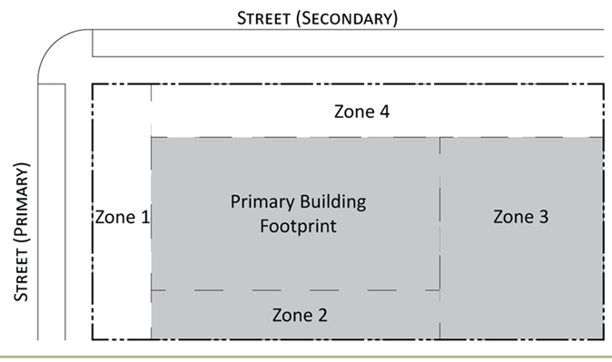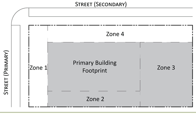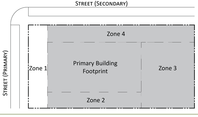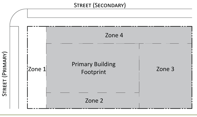 Parking provisions: The amount of parking shall be determined by Article XII, Off street parking, of the Land Development Regulations. Parking provisions provide zones where parking is permitted. The parking zone refers to any uncovered parking area located on the parcel in accordance to Appendix A, Article 12. Driveways are permitted in any zone provided the frontage requirements have been met as required by building type. The diagram illustrates a Primary and Secondary street. Primary streets are streets that are addressed to the parcel of land. Secondary streets may or may not have access to the parcel. Zones are defined and illustrated by the lot area between the principal building frontage and: