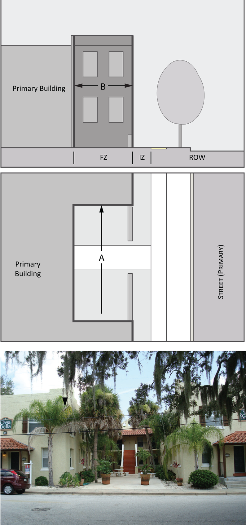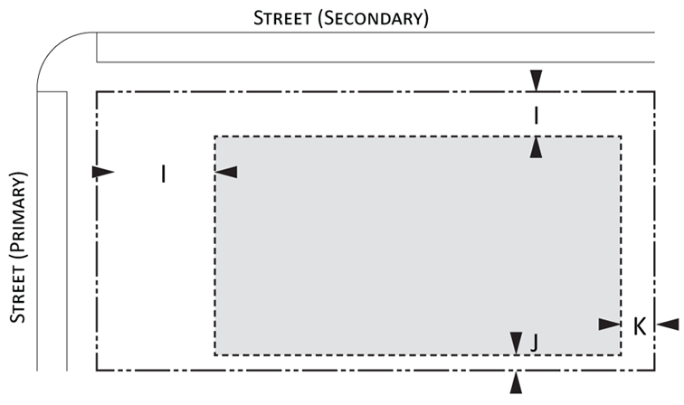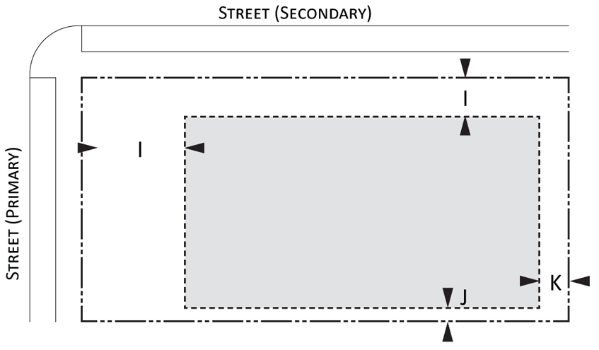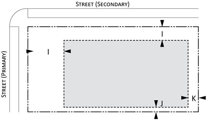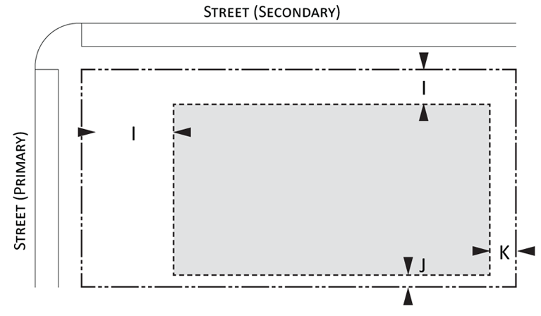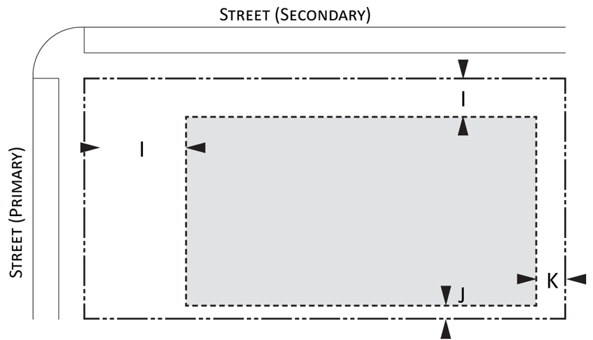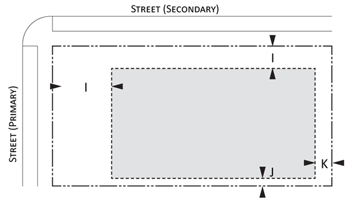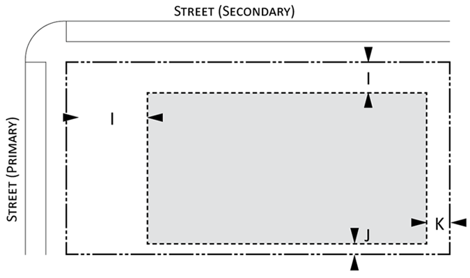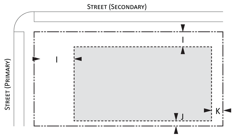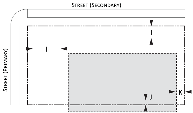 Parking provisions: The amount of parking shall be determined by Article XII, Off street parking, of the Land Development Regulations. Parking provisions provide zones where parking is permitted. The parking zone refers to any uncovered parking area located on the parcel in accordance to Appendix A, Article 12. Driveways are permitted in any zone provided the frontage requirements have been met as required by building type. The diagram illustrates a Primary and Secondary street. Primary streets are streets that are addressed to the parcel of land. Secondary streets may or may not have access to the parcel. Zones are defined and illustrated by the lot area between the principal building frontage and: