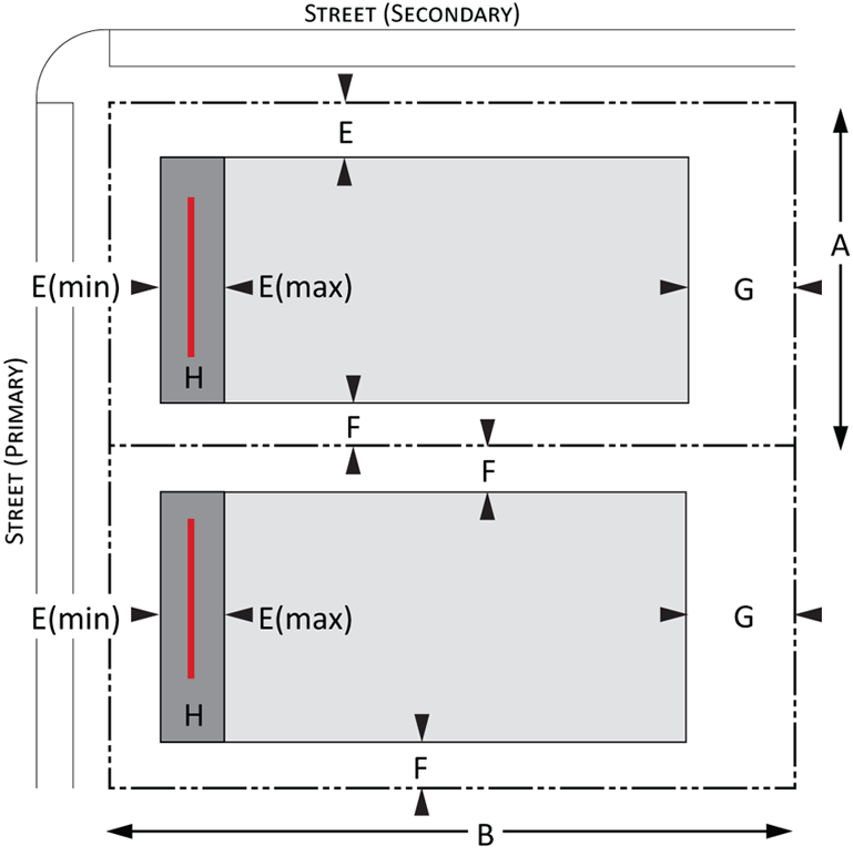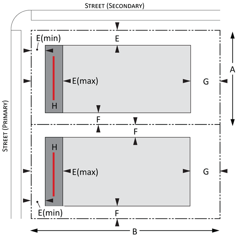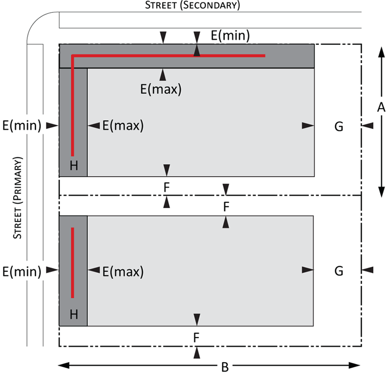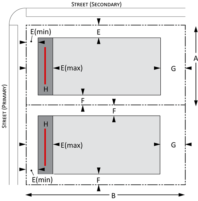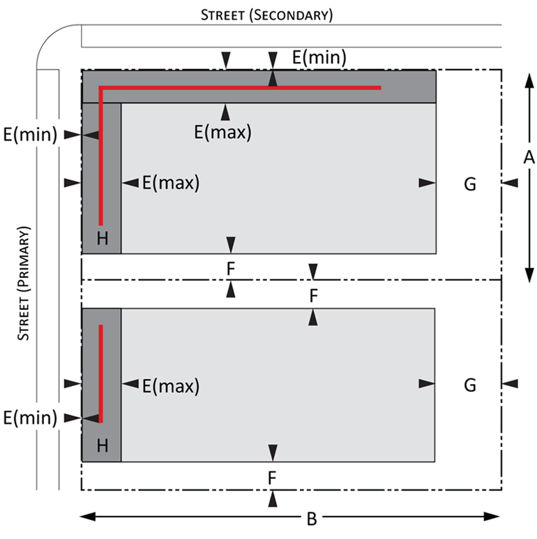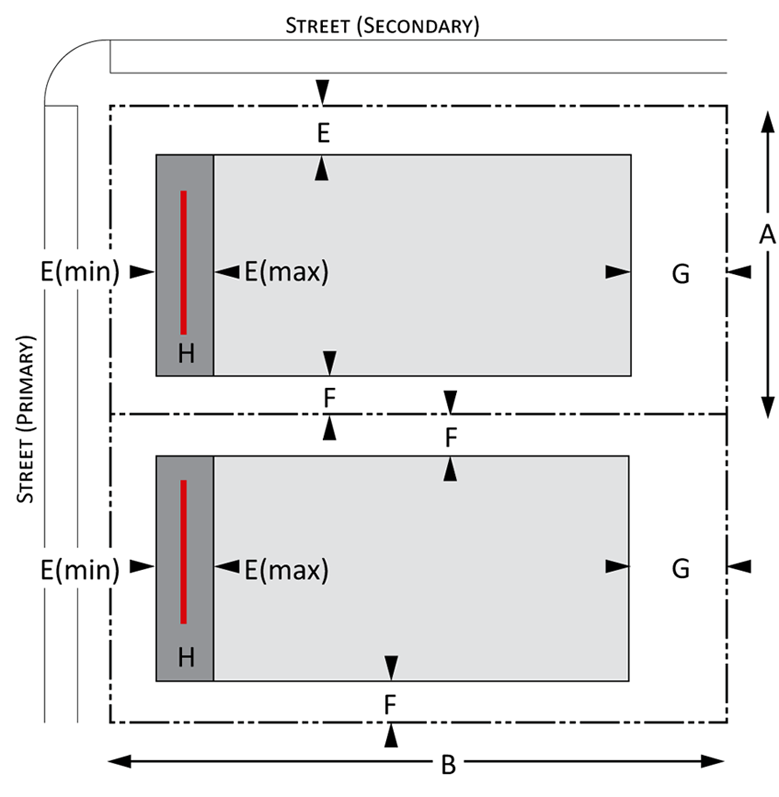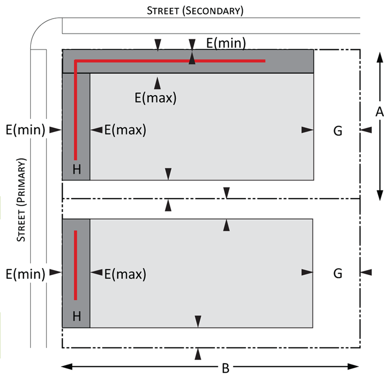 Building envelope: Provisions for the minimum and maximum setbacks permitted by front, side, and rear yards for Urban and Suburban development. There is a minimum and maximum setback for each lot type. The maximum and minimum frontage refers to the proportion of the lot width along which the primary building façade must be within the minimum and maximum front setback; and