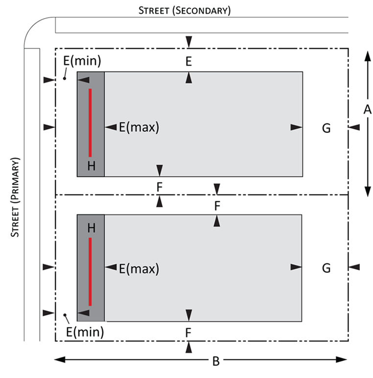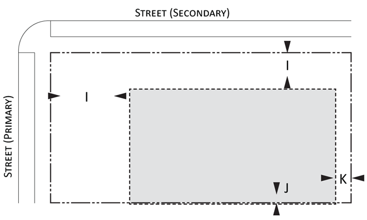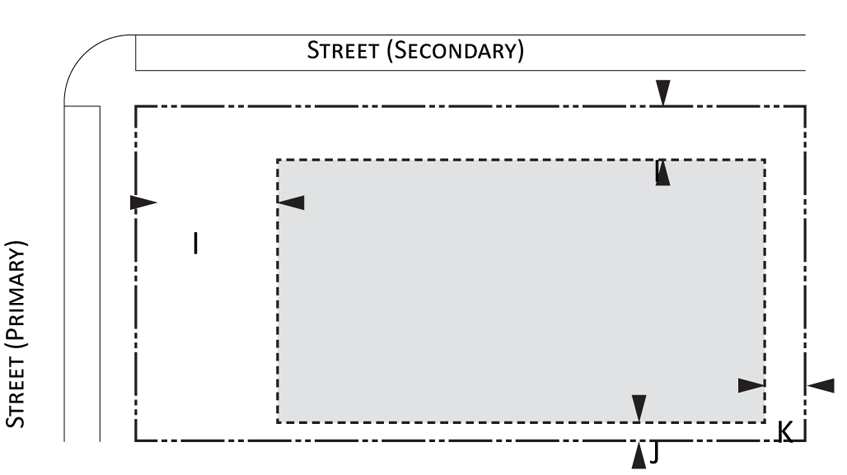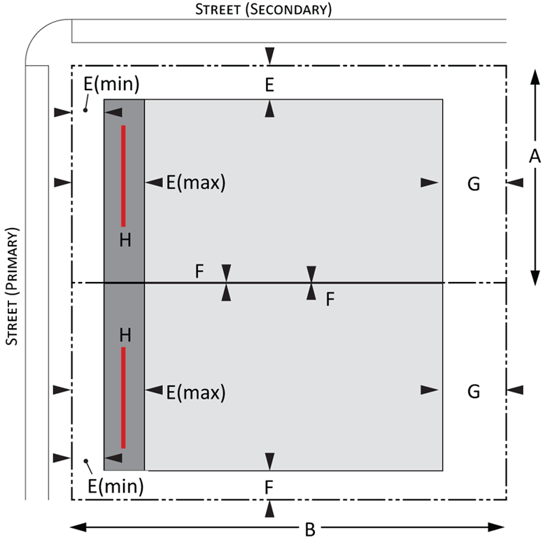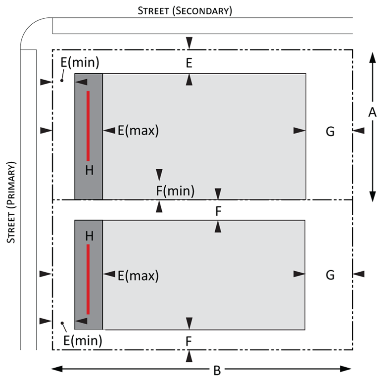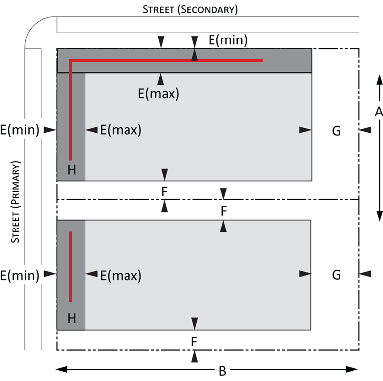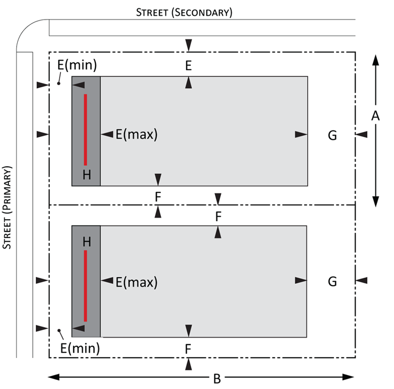 Building envelope: Provisions for the minimum and maximum setbacks permitted by front, side, and rear yards for Urban and Suburban development. There is a minimum and maximum setback for each lot type. The maximum and minimum frontage refers to the proportion of the lot width along which the primary building façade must be within the minimum and maximum front setback; and