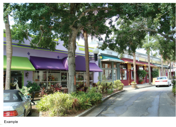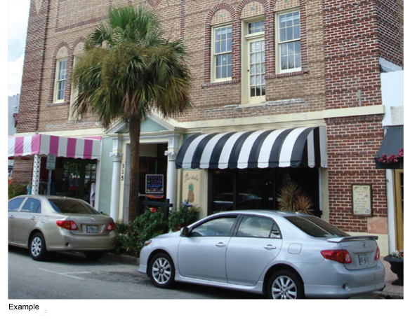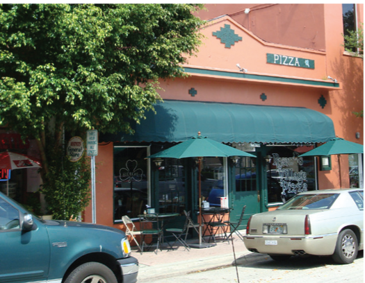 The facade is set back from the front lot line per applicable street setback requirements, typically at or near the front lot line with the entrance at siewalk grade. The facade may include an awning, shed roof, or gallery (a lightweight colonnade with no habitable building space above it) that covers the sidewalk and may extend into the right-of-way. The facade has a substantial amount of glazing at the sidewalk level. Recessed entrances are acceptable.