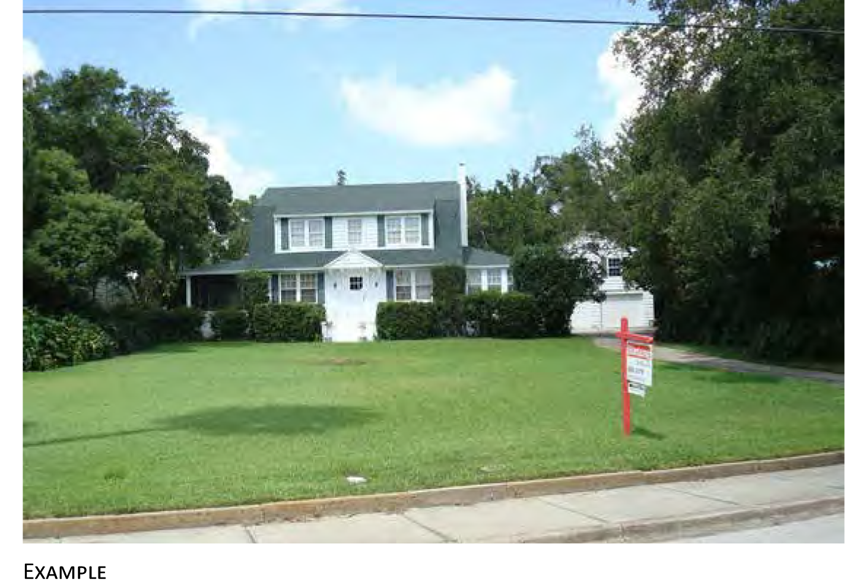 A building lot located and designed to accommodate a detached building with small side yards and a large front yard.