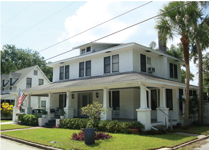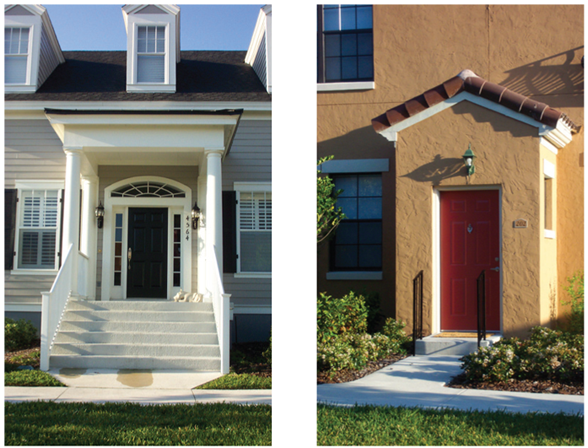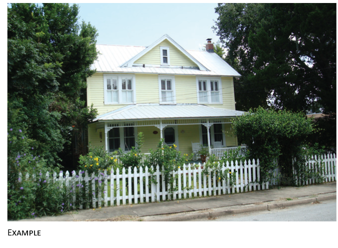 The facade is set back from the front lot line per applicable street setback requirements. The facade includes an attached front porch structure. A wide variety of porch designs are possible.