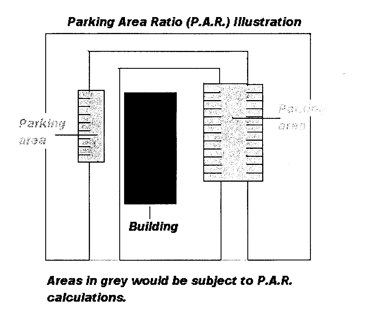 Formula: Square footage of use × P.A.R. = Total area permitted to be dedicated to parking spaces and drive aisles.