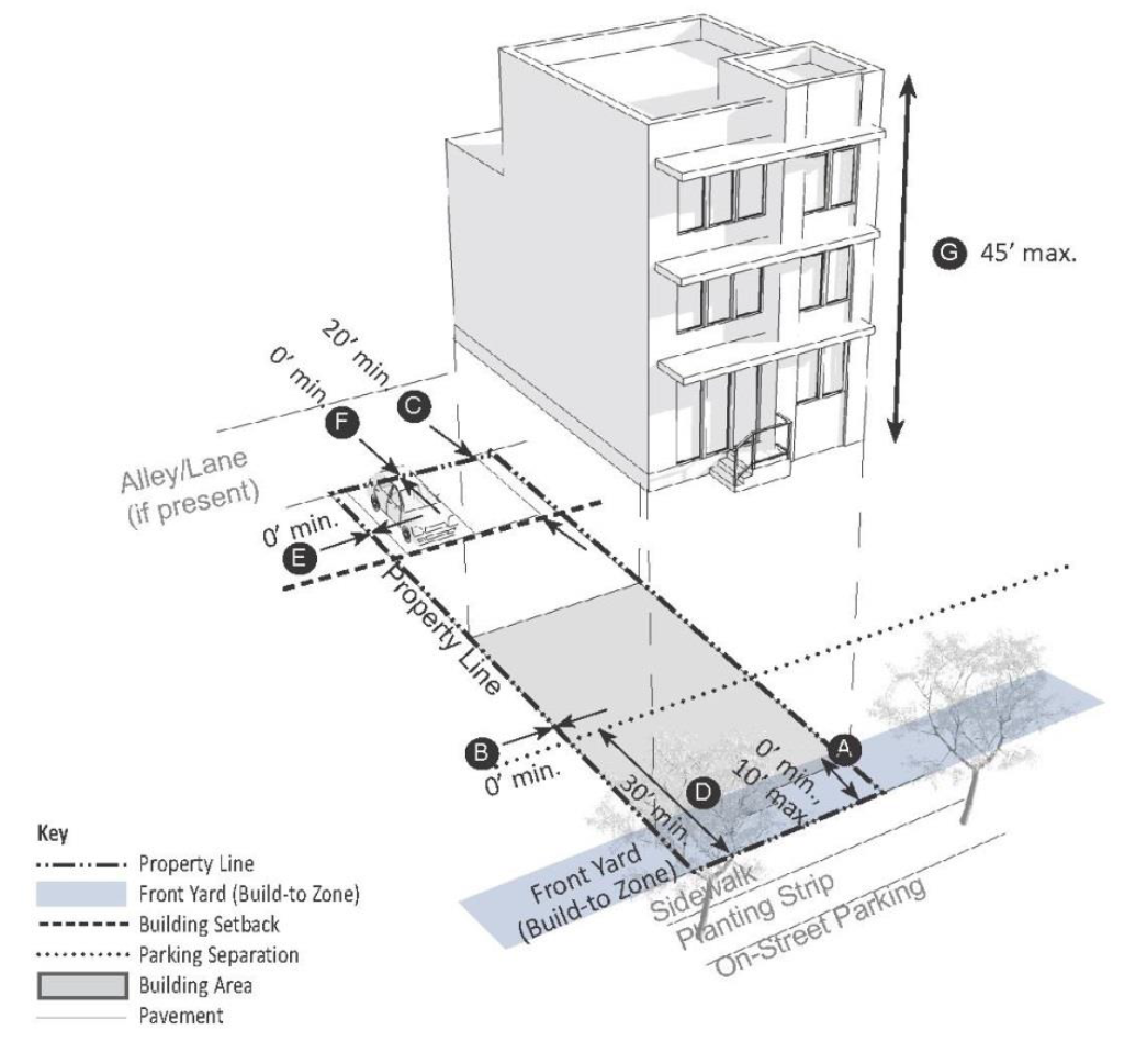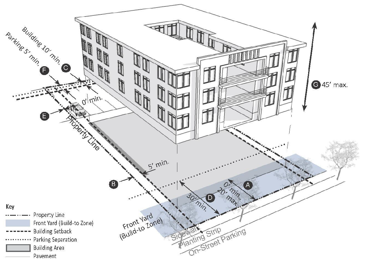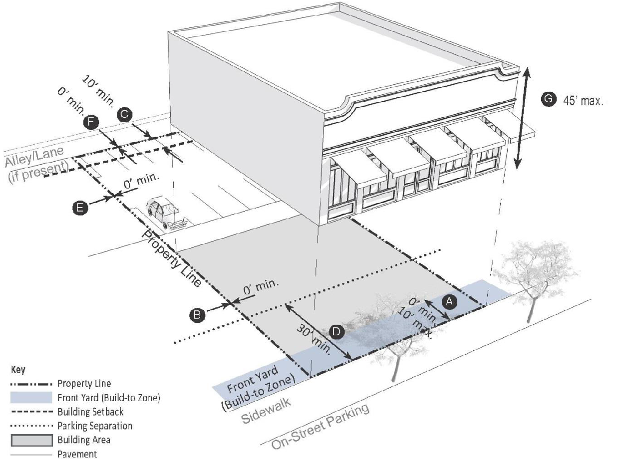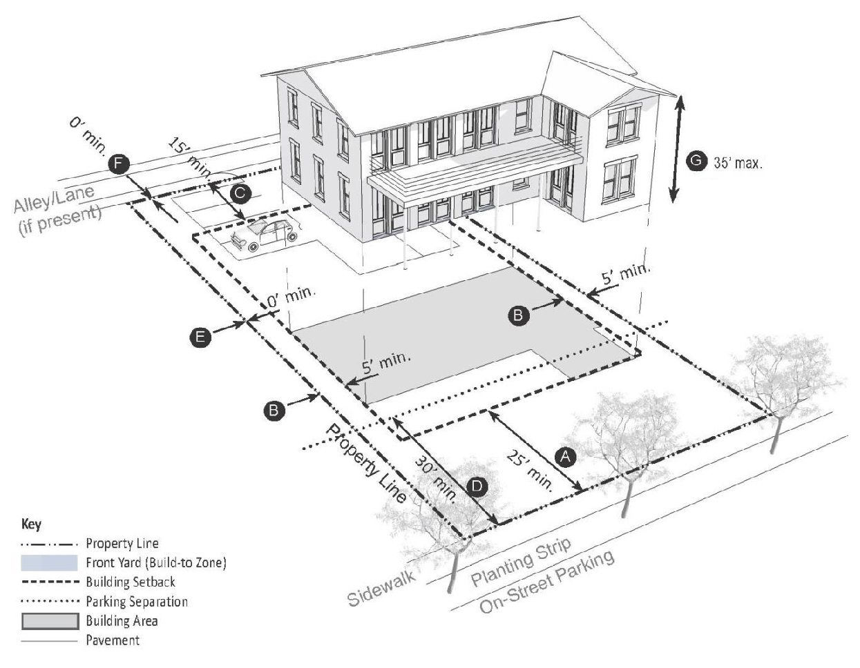 The dimensional design standards for standard zoning districts in this article are detailed within each zoning district description and summarized in Tables 2-16 and 2-17.