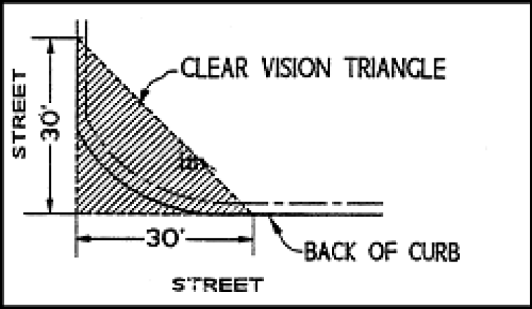 "Clear vision triangle, commercial" means that portion of both private property and public right-of-way located at any corner defined by the triangular area created by the diagonal connection of two points measured thirty (30) feet back from the intersection of the prolongation of points measured along the front and corner street side back of curb (see figure below). The dimensions of the clear vision triangle may be required to be increased if the director of public works determines that additional area is needed to ensure that a potential traffic hazard is not created.