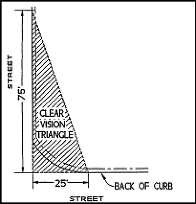 "Clear vision triangle, residential" means that portion of both private property and public right-of-way located at any corner defined by the triangular area created by the diagonal connection of two points measured 25 feet along the front and 75 feet along the side of a property measured from the back of curb. The third side of the clear vision triangle shall be the hypotenuse of the triangle described connecting the other two sides (see figure below). The dimensions of the clear vision triangle may be required to be increased if the director of public works determines that additional area is needed to ensure that a potential traffic hazard is not created.