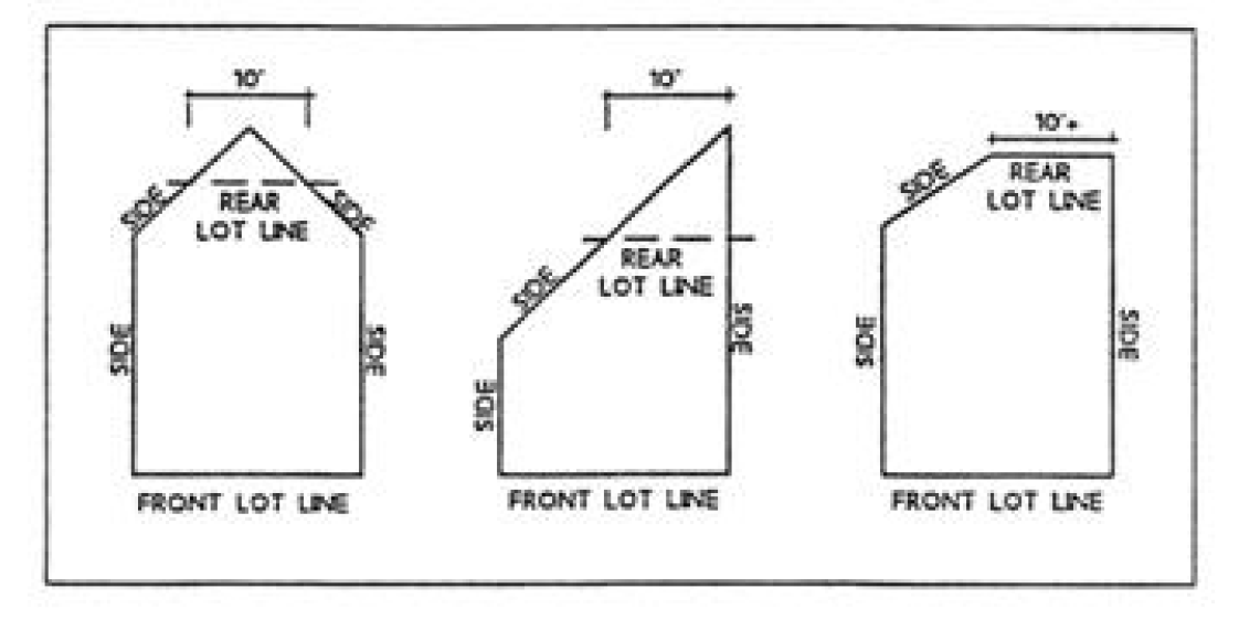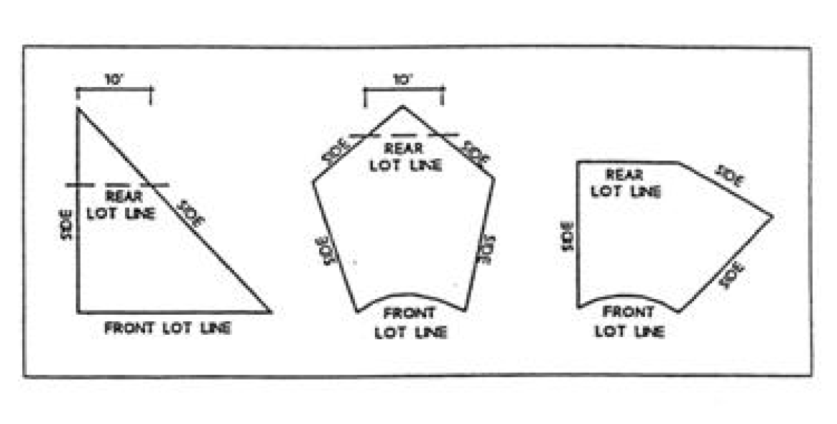 "Lot line, rear" means that lot line, not intersecting a front lot line, which is most distant from and most closely parallel to the front lot line. In the case of an irregularly-shaped lot or a lot bounded by only three lot lines, a line within the lot having a length of ten (10) feet parallel to and most distant from the front lot line shall be interpreted as the rear lot line for the purpose of determining required yards, setbacks, and other provisions of this title. (see figures below)