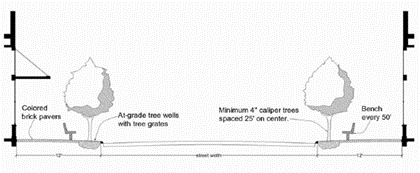 Maximum side street and front setbacks may be measured from the edge of a public easement when it is greater than the maximum setback. Maximum setbacks may be increased to up to eighty-five (85) feet to accommodate a parking lot between the structure and the street. Maximum setback requirements may be fulfilled through the use of plazas, outdoor dining, and bicycle parking.