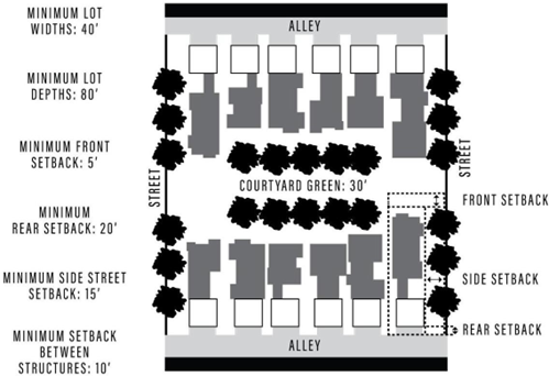 All courtyard houses must be served by rear or side alleys, with at least one side of the development having frontage to a public street as shown in the diagram below: