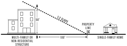 Multi-family and multiplex structures, structures with shared housing uses, and non-residential structures shall not be taller than fifty (50) percent of the linear distance from the property line that is shared with a single-family, manufactured home park, or townhouse use or district as illustrated by the inclined plane in the graphic below.