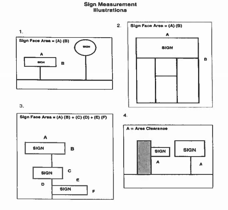 The area of a sign is determined by the outer dimensions of the frame or cabinet surrounding the sign face (Illustration 1). Sign area does not include foundations or supports. Only one side of a double-faced or V-shaped, freestanding sign is counted.