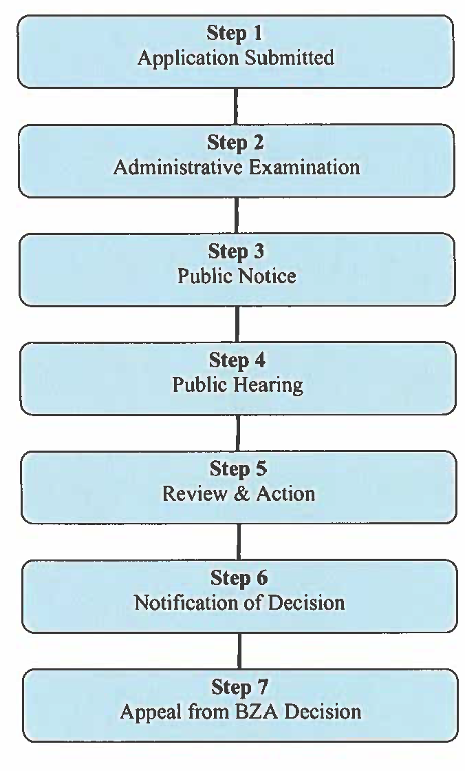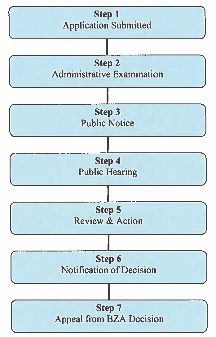This process shall be followed for special exception uses as listed for each zoning district in article 14.08-2. See the details following the below chart for each step.