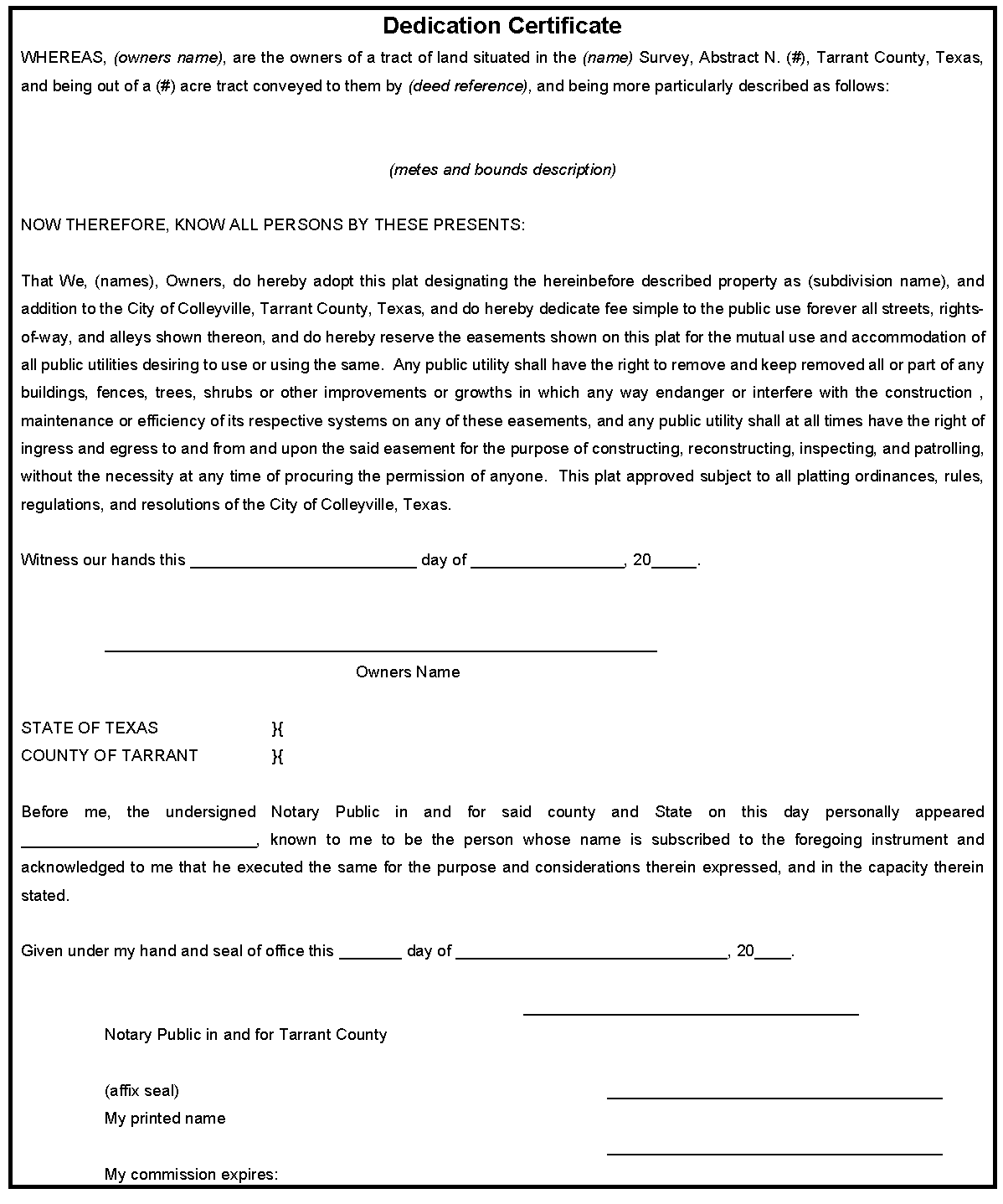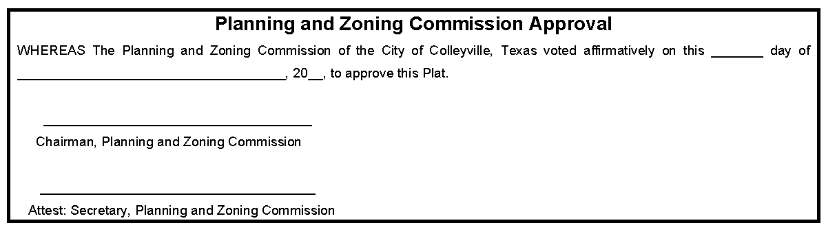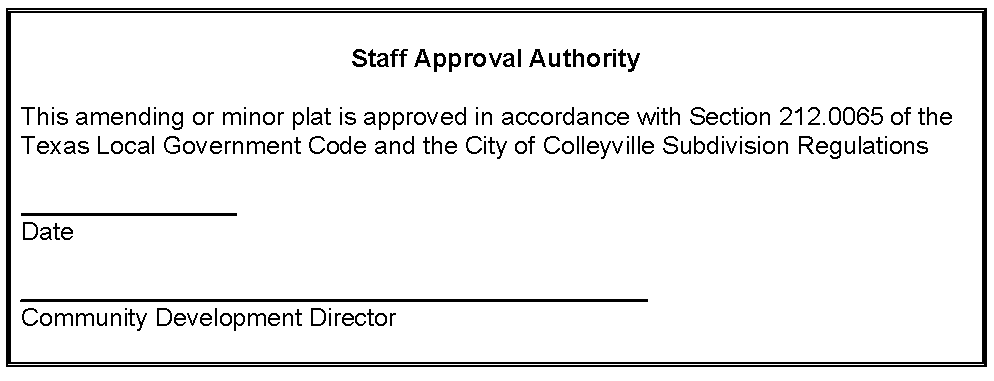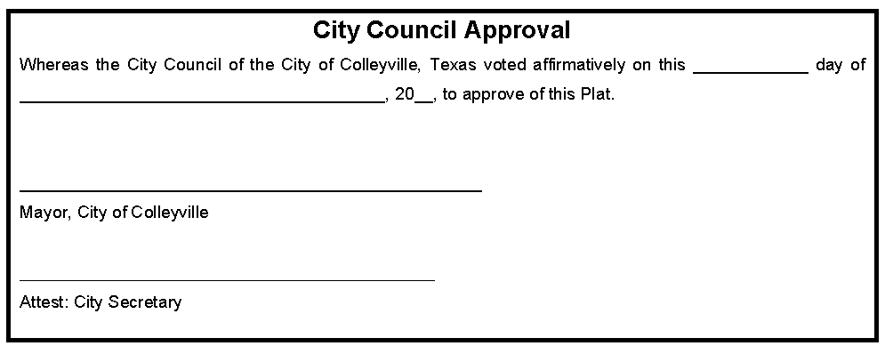 City Limit Lines: The general location of the city limit boundaries of the City of Colleyville and any adjacent city shall be shown on the plat and referenced per city maps, only.