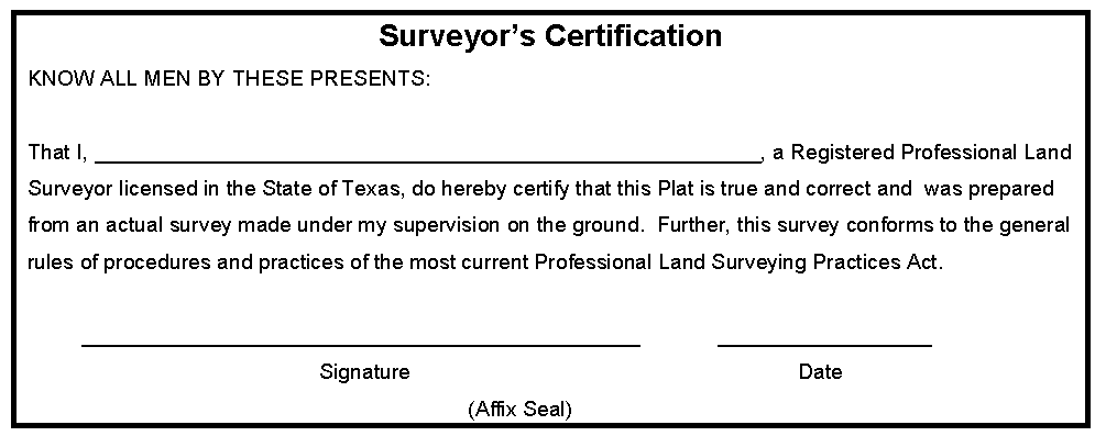 Surveyor Name: The name, address and telephone number of the surveyor responsible for the plat which shall contain the seal of a Texas Registered Professional Land Surveyor.