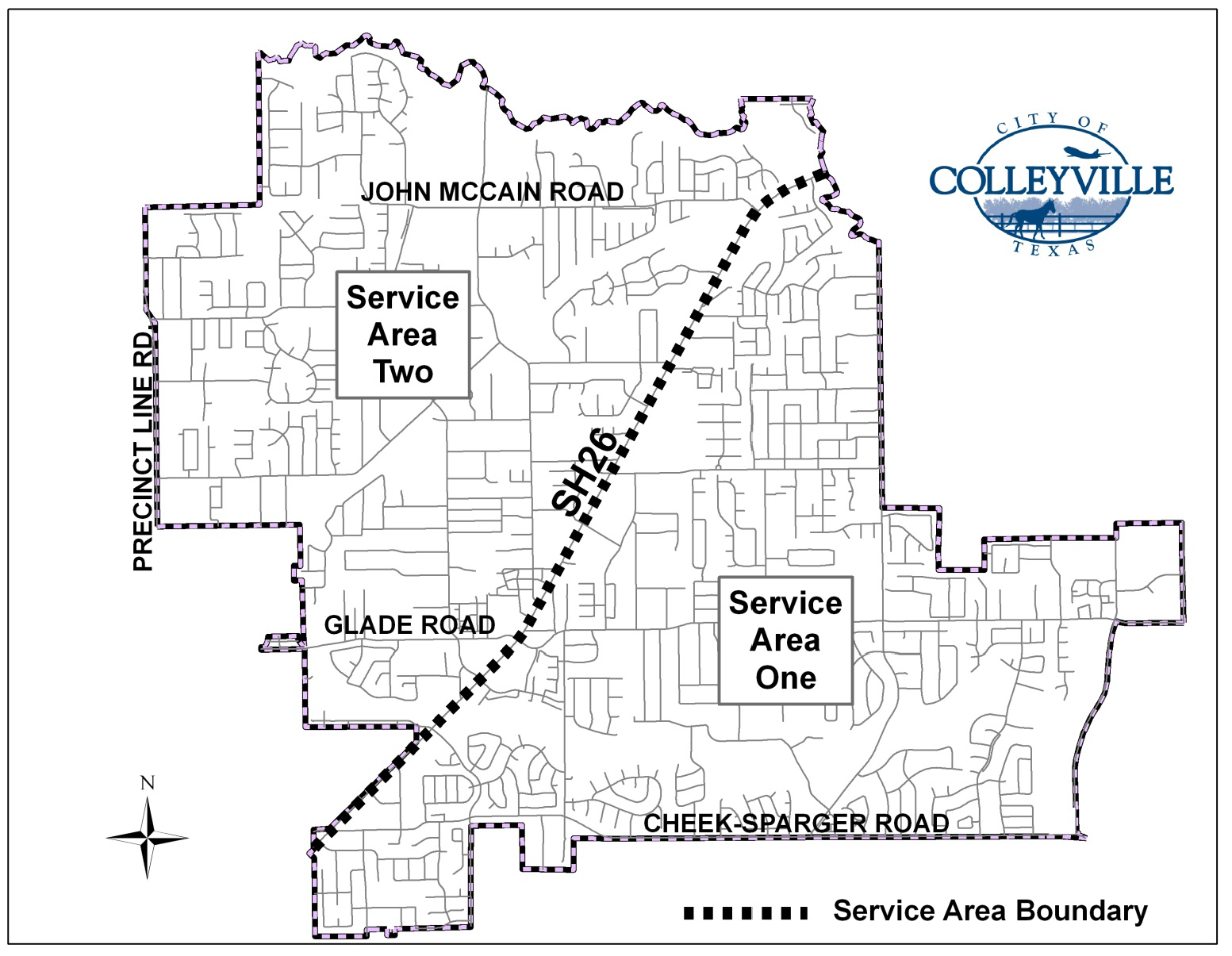 The water, wastewater and roadway service areas are established as shown on the Service Area Map, attached as Exhibit 13-8 - Service Area Map. The service areas shall be established consistent with any facility service area established in the CIP for each utility.
