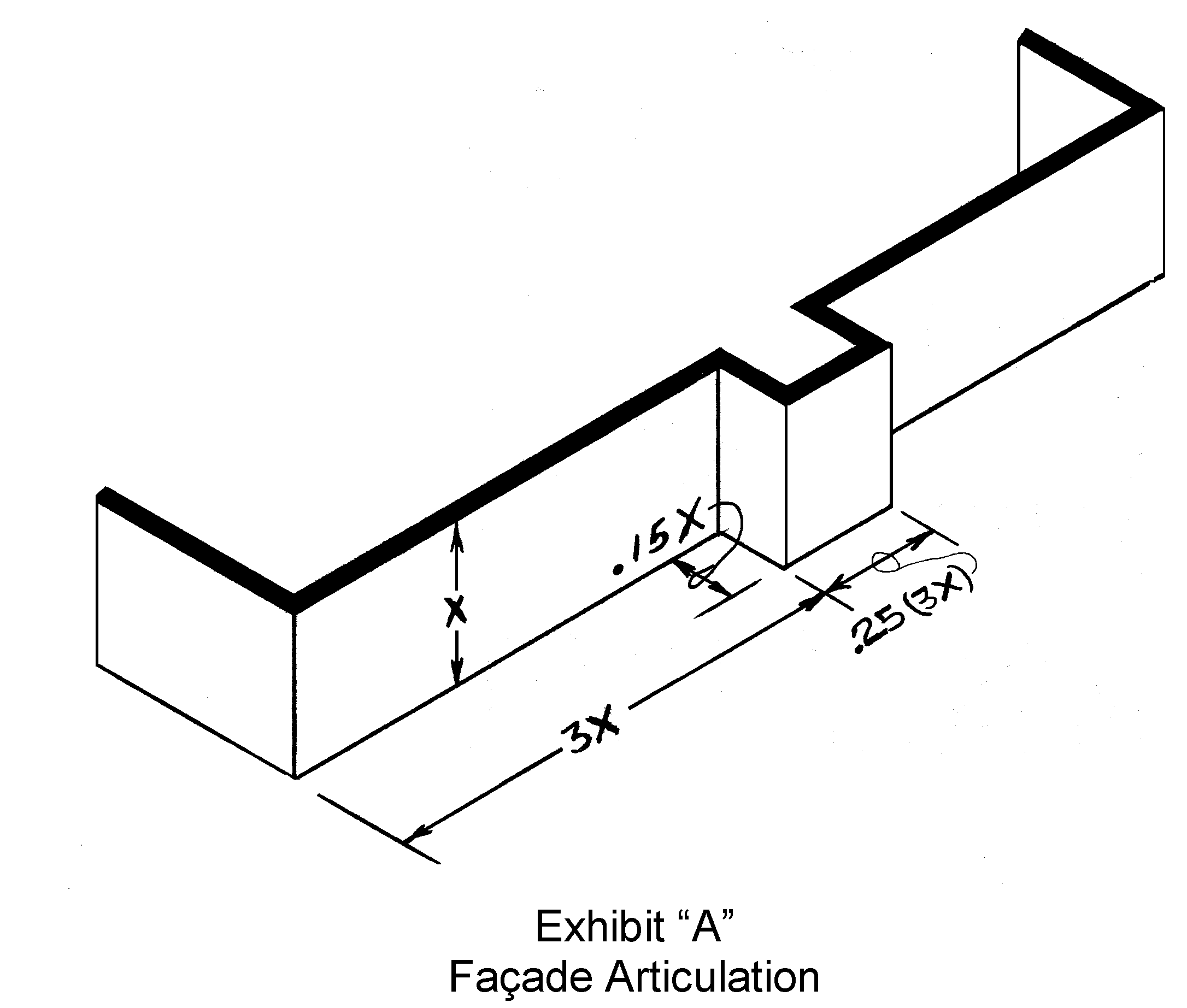 Horizontal Articulation. No building façade visible from a public street or parking area shall extend horizontally greater than three (3) times the height of the wall without having an off-set of not less than fifteen (15%) percent of the wall's height as shown on the attached Exhibit "A", and such off-set shall continue for a minimum distance equal to at least twenty-five (25%) percent of the length of the longest adjacent plane.