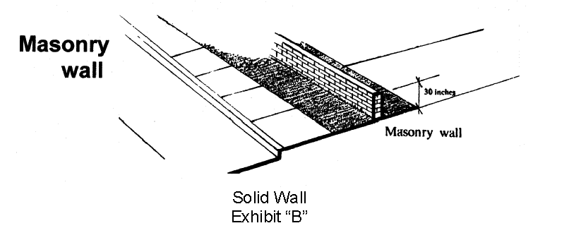 Low Solid Wall. A solid wall constructed of clay-fired brick, native stone, cast stone, or a combination of these materials, not less than thirty (30) inches in height as shown on the attached Exhibit "B" shall be provided where parking is provided adjacent to a street right-of-way. Said wall shall be constructed generally parallel to and twenty (20) feet from the street right-of-way.